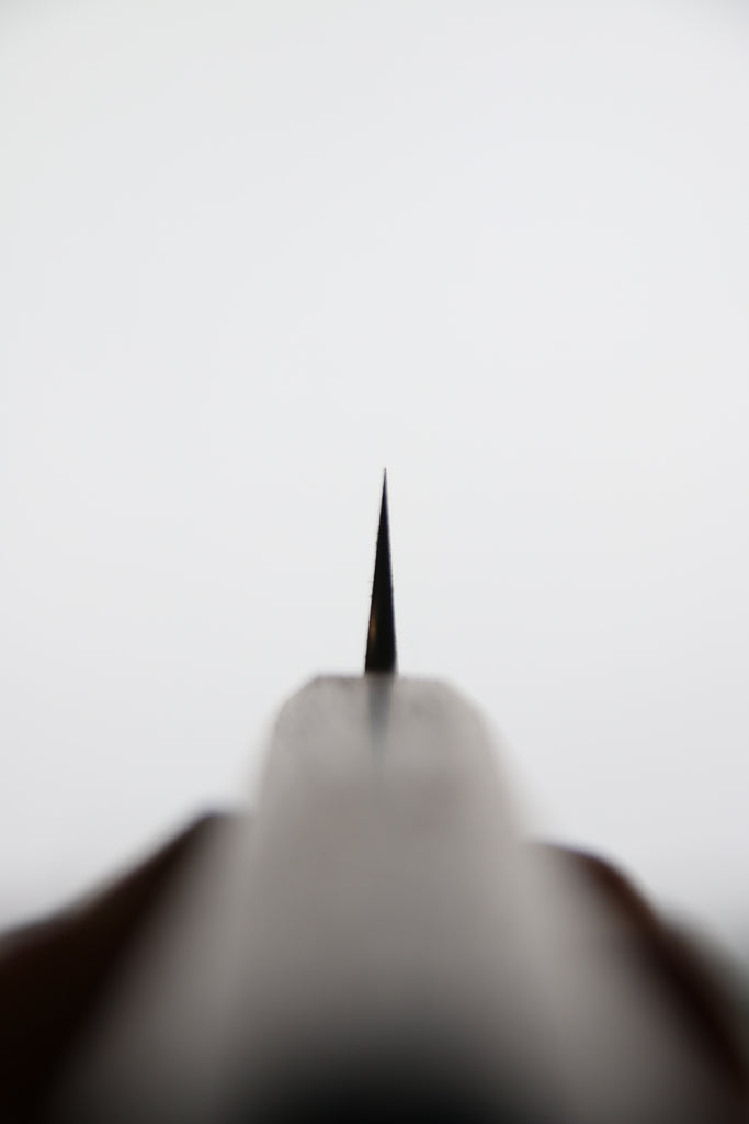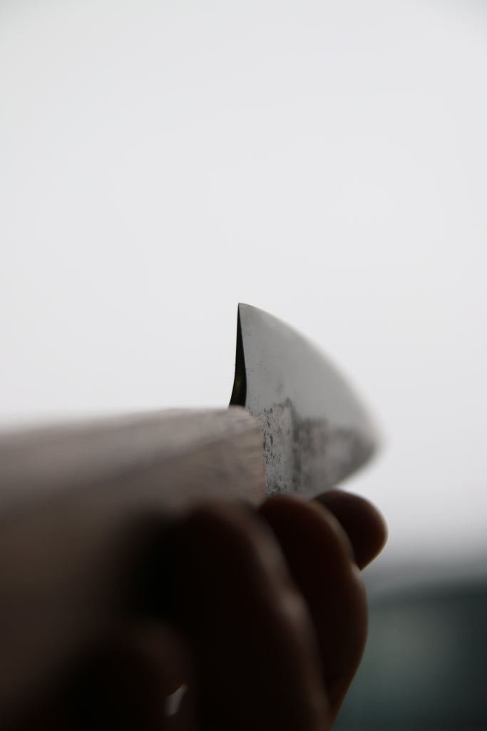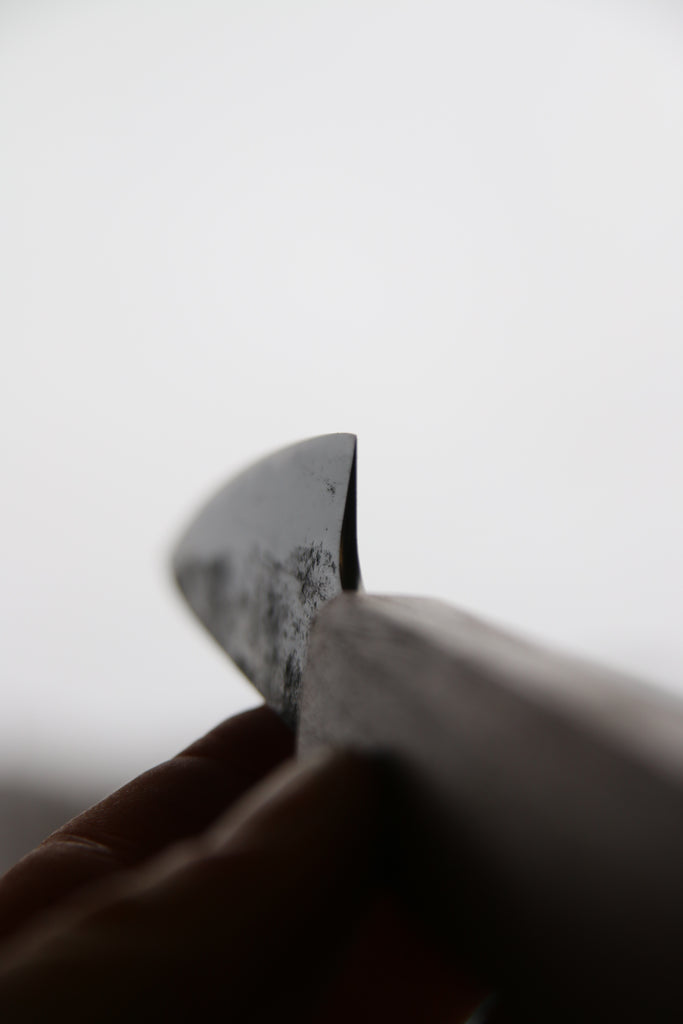 Kurouchi (blacksmith finish), flat double bevel, kasumi.
