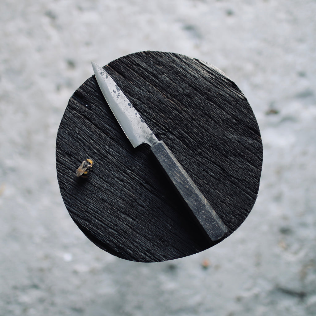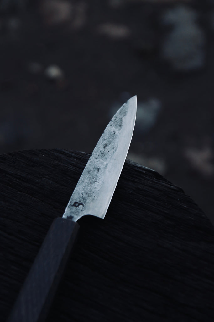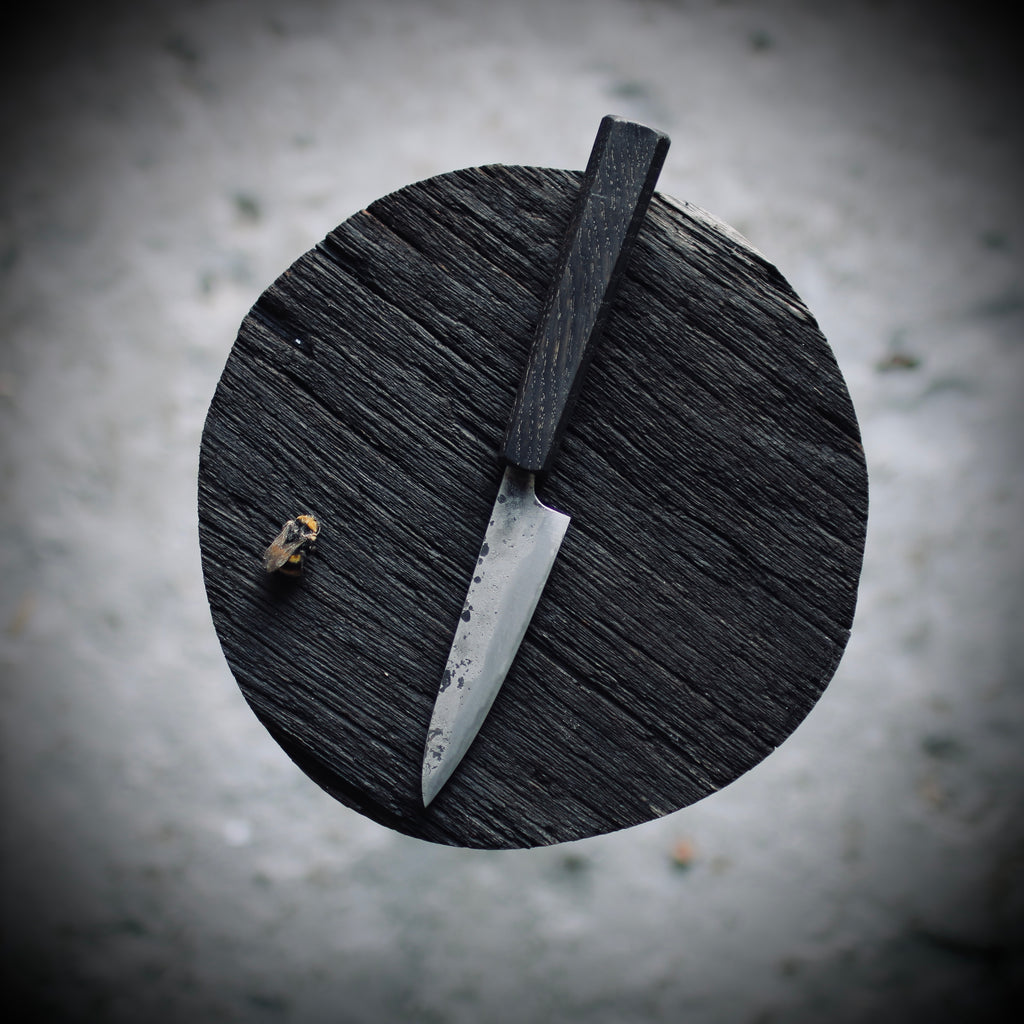 Petty 110x25mm, San-maï hand forged from Aogami Super core and soft steel clad in Sheffield.
