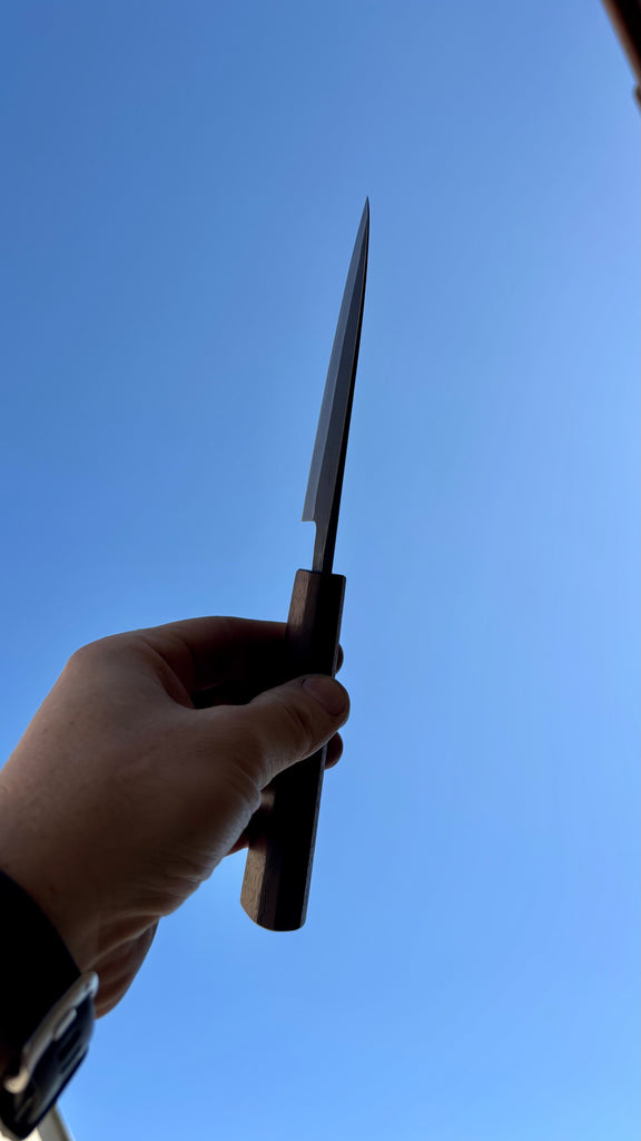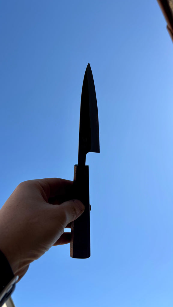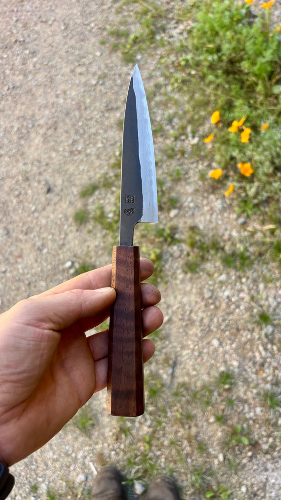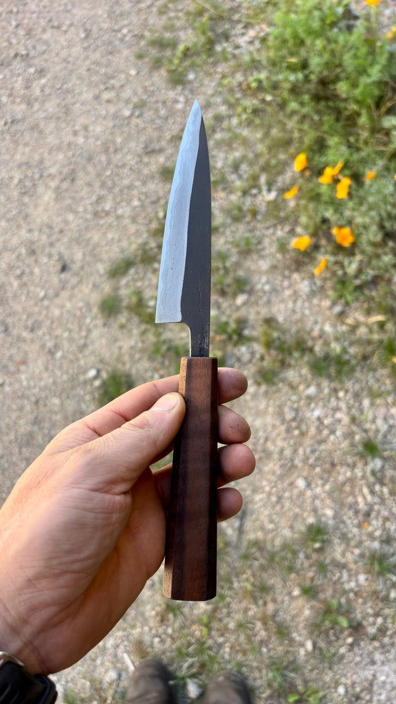 This Tetsu Petty feature a small but nimble blade, good distal taper, thin tip. Flat profile at the heel with a slight curve toward the tip. The San-mai is laminated by myself in house. Forged to shape and to geometry the blade is ground on water cooled grinding wheel.