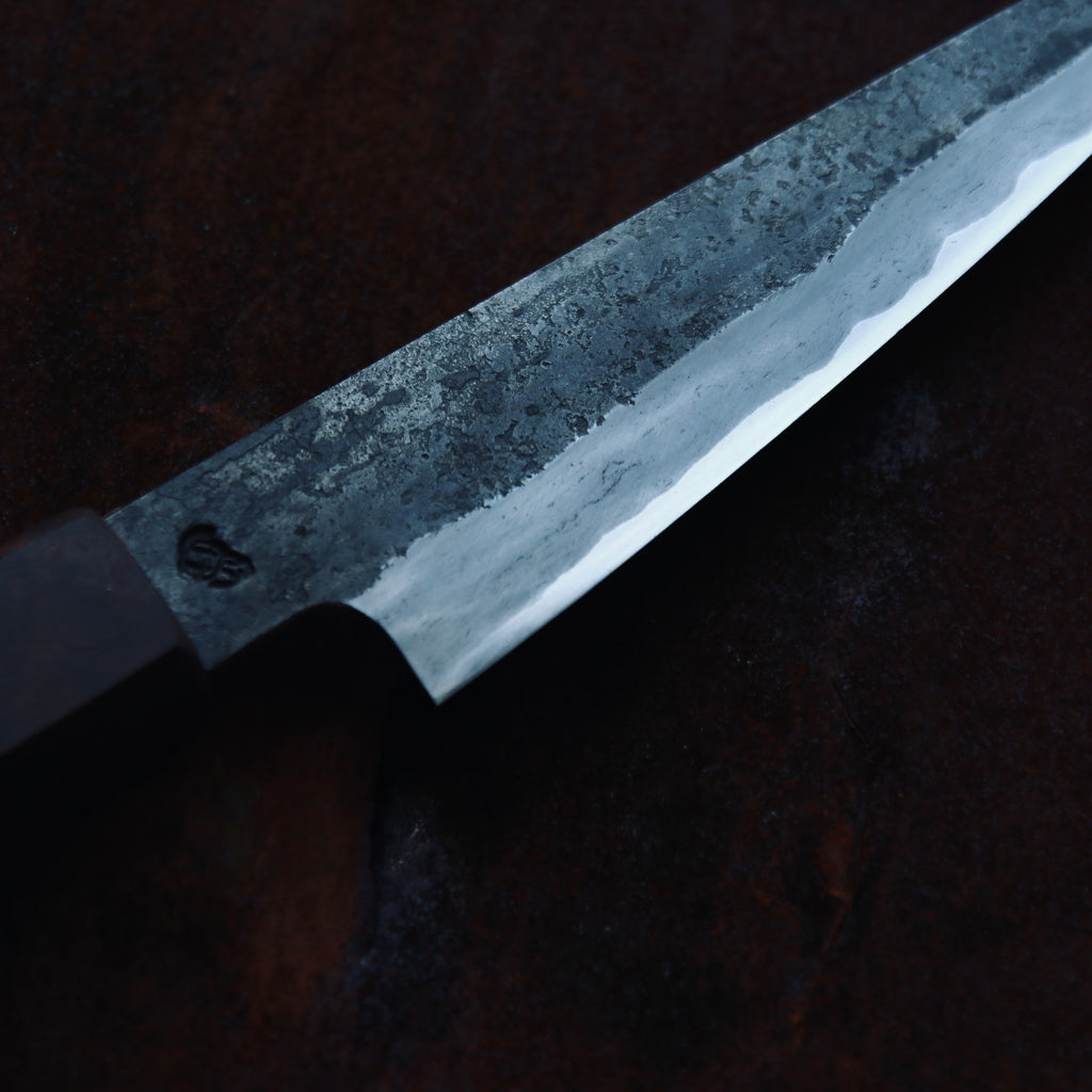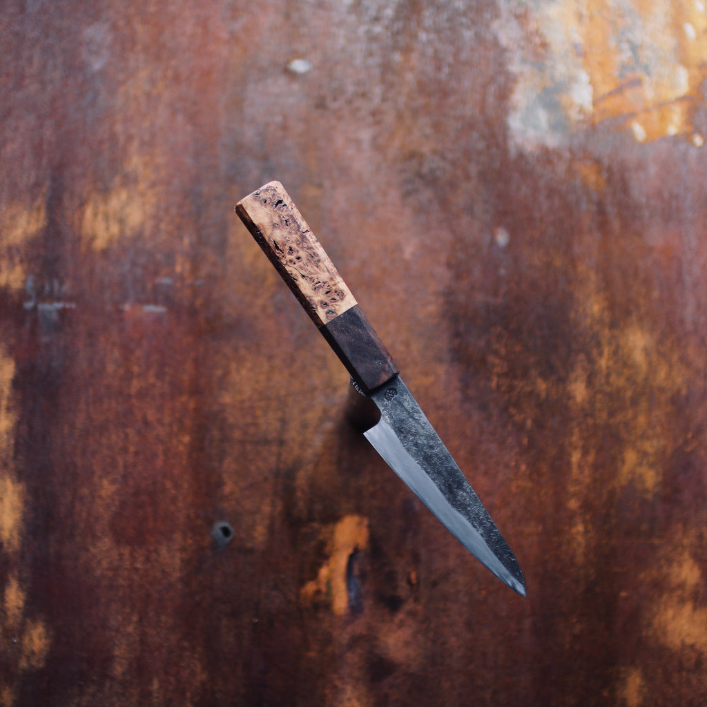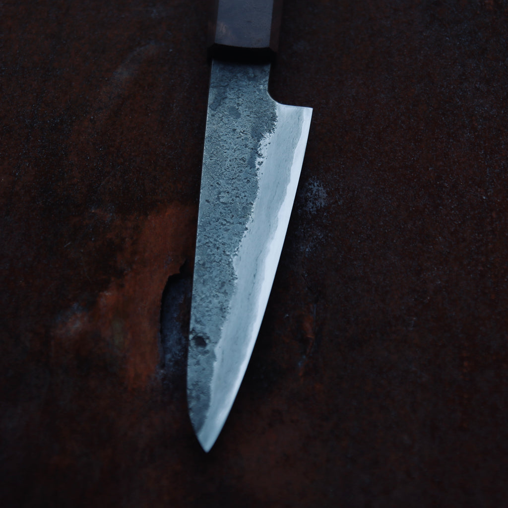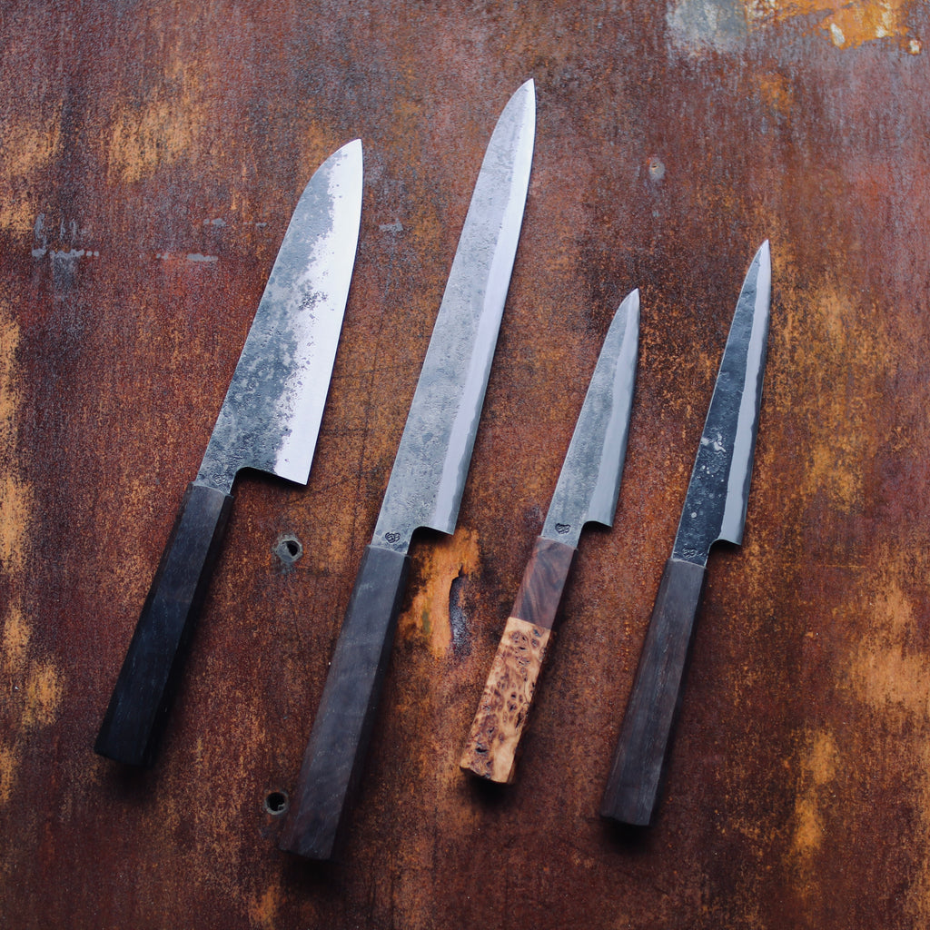 My blades are made from carbon steel not stainless steel, it gives my knives an unbeatable sharpness. I prefer carbon steel for it ease to sharpen, the fine edge it takes and the beautiful patina that will develop. You do, however, need to give carbon steel knives just a little extra care to keep them in top shape. There are trade-offs in everything.