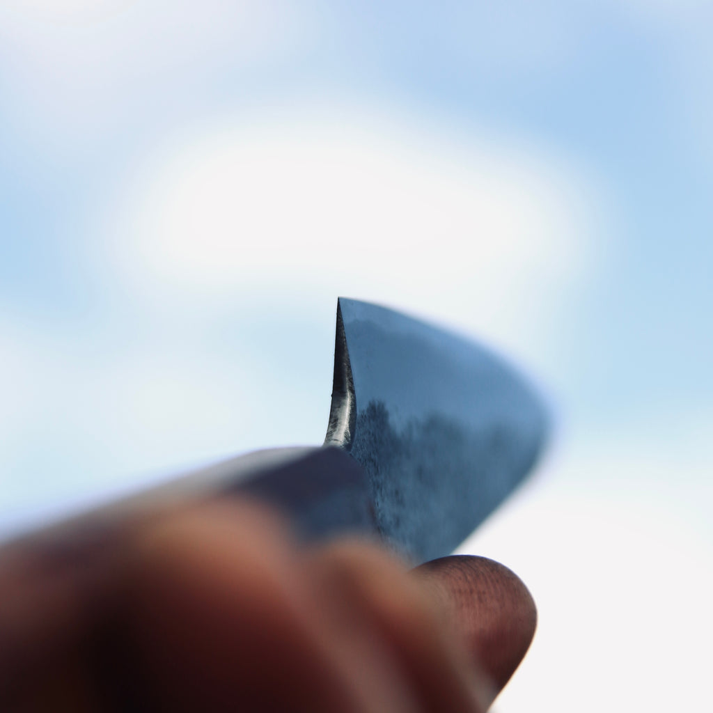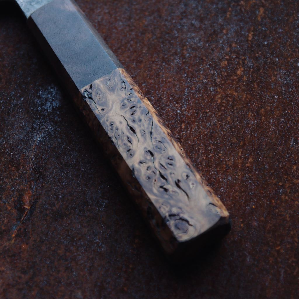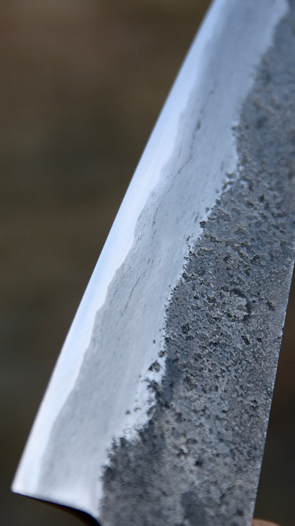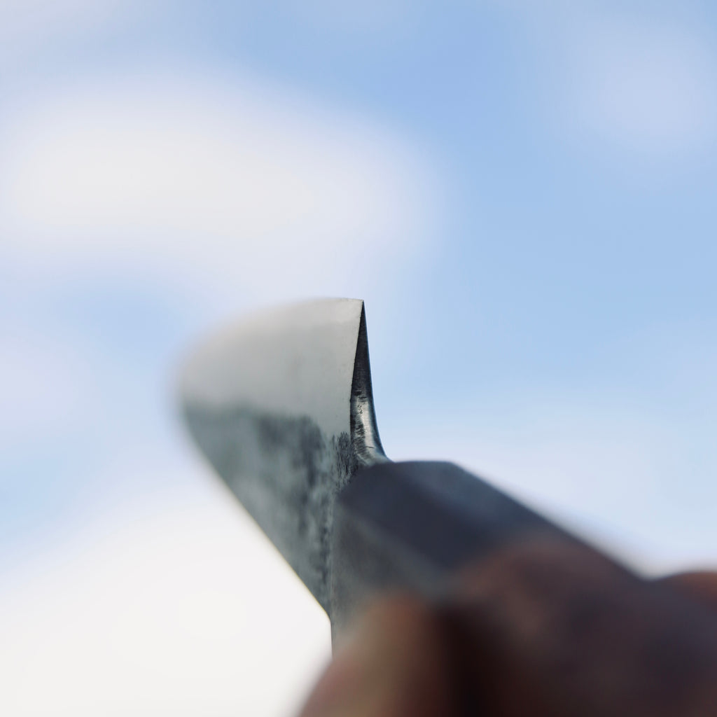 My blades are made from carbon steel not stainless steel, it gives my knives an unbeatable sharpness. I prefer carbon steel for it ease to sharpen, the fine edge it takes and the beautiful patina that will develop. You do, however, need to give carbon steel knives just a little extra care to keep them in top shape. There are trade-offs in everything.