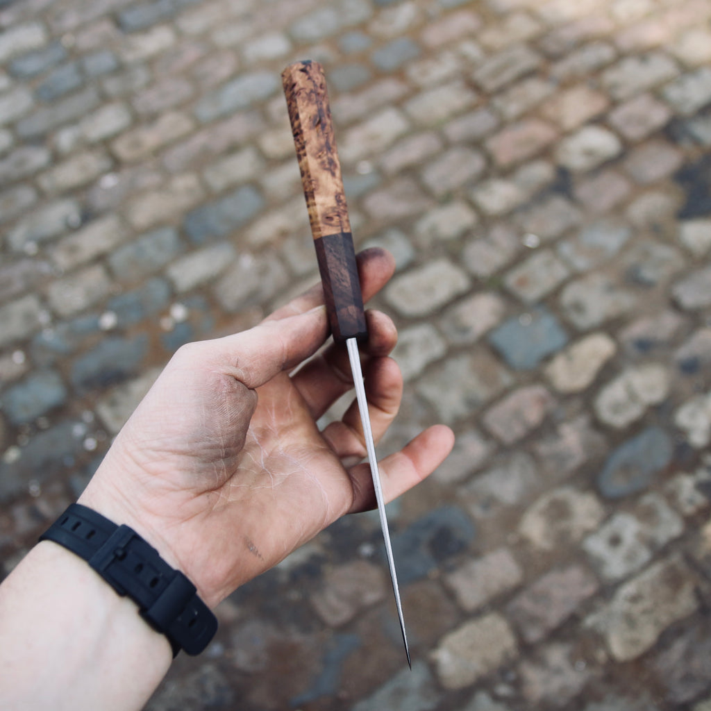 Small knife with a good taper but a nimble tip. The wrought iron for the cladding was forged in an Anchor link chain from Cornwall. Distal taper from 4.25mm at the handle to 2.4mm mid blade to 0.9mm at the tip. Core harden at 63-64HRC.