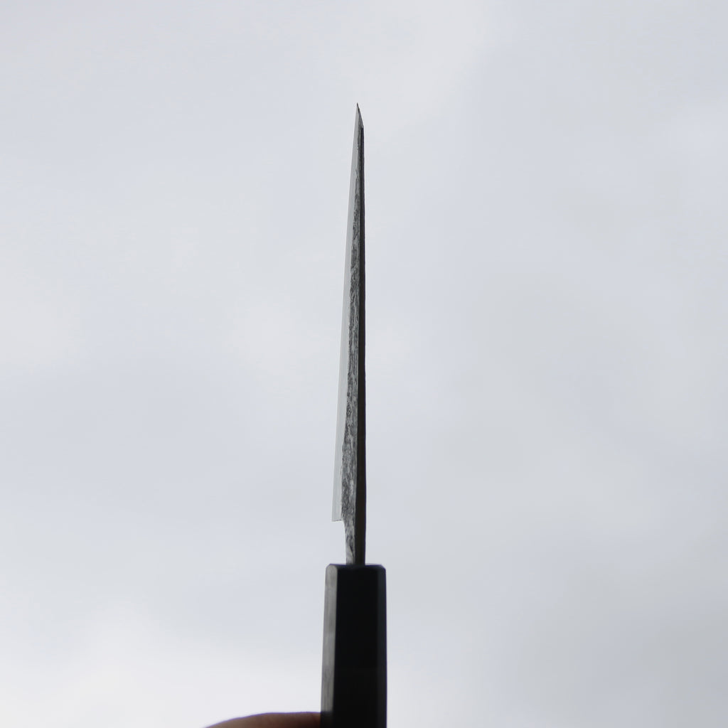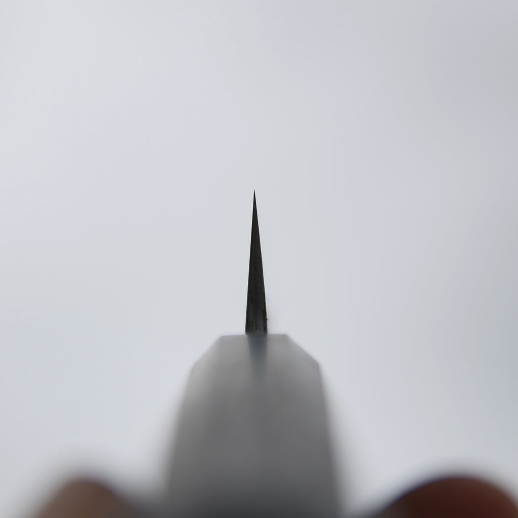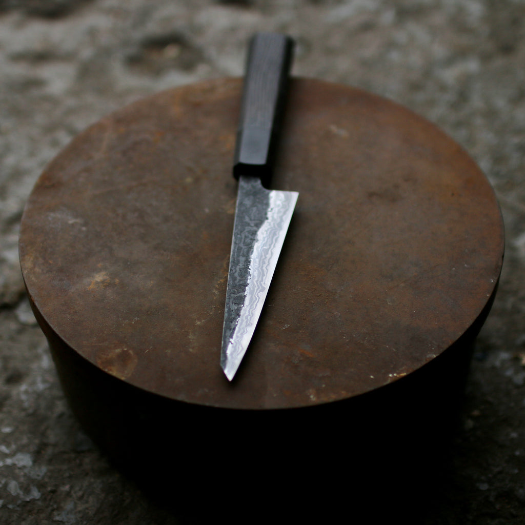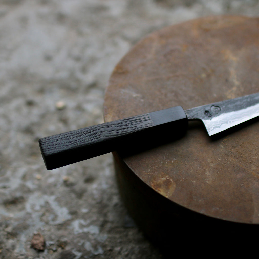 This San-maï Petty feature a thin blade with a K-tip, good distal taper and nimble tip. It give to this blade a good maneuverability. Confortable pinch grip with the polished spine and choil as well as the Emoto. The burnt Oak and black horn ferrule Wa handle compliment the blade.