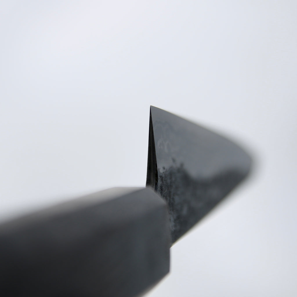 My blades are made from carbon steel not stainless steel, it gives my knives an unbeatable sharpness. I prefer carbon steel for it ease to sharpen, the fine edge it takes and the beautiful patina that will develop. You do, however, need to give carbon steel knives just a little extra care to keep them in top shape. There are trade-offs in everything.