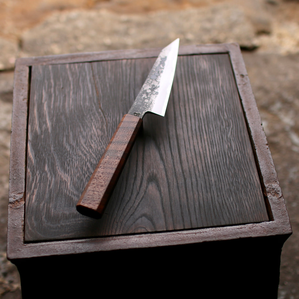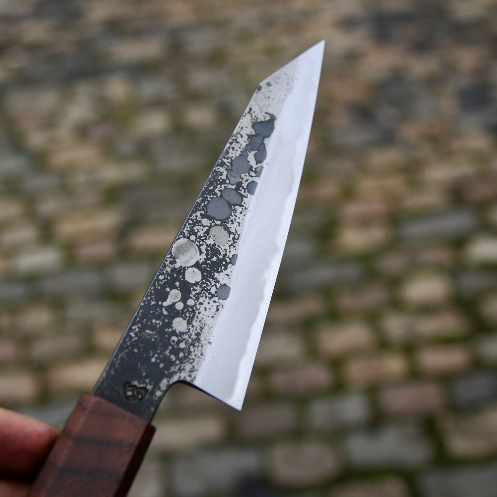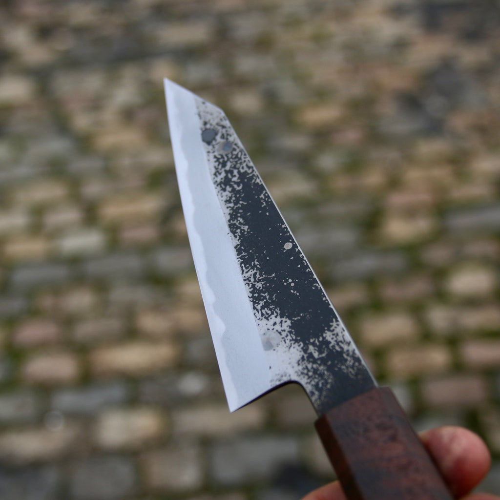 This Tetsu Petty feature a short and tall ish blade, good distal taper, and very thin K-tip. Flat profile with a slight curve toward the tip. The san-maï is made from Spicy white 26C3 core steel with soft iron cladding. Forged to shape and to geometry the bevels are ground on water cooled grinding stone with a satin finish.
