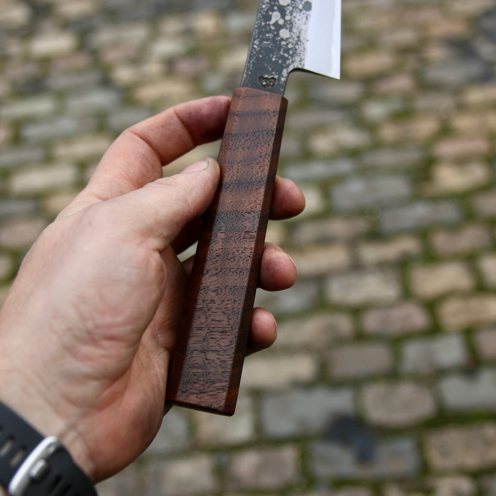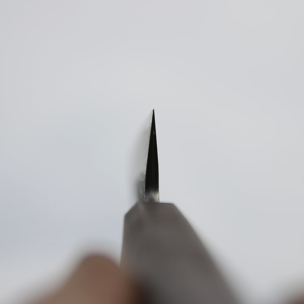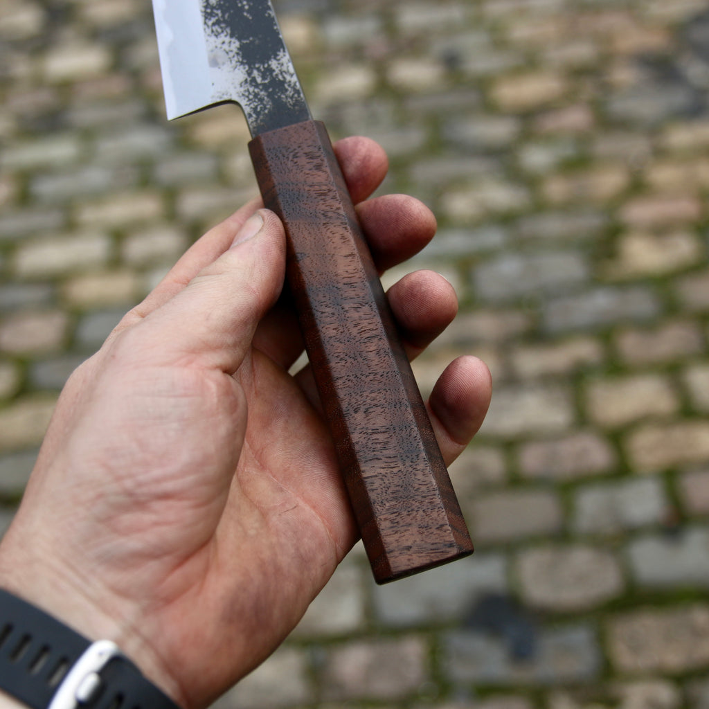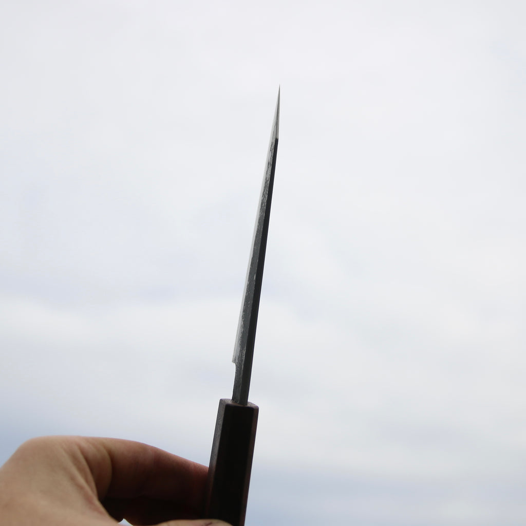 This Tetsu Petty feature a short and tall ish blade, good distal taper, and very thin K-tip. Flat profile with a slight curve toward the tip. The san-maï is made from Spicy white 26C3 core steel with soft iron cladding. Forged to shape and to geometry the bevels are ground on water cooled grinding stone with a satin finish.