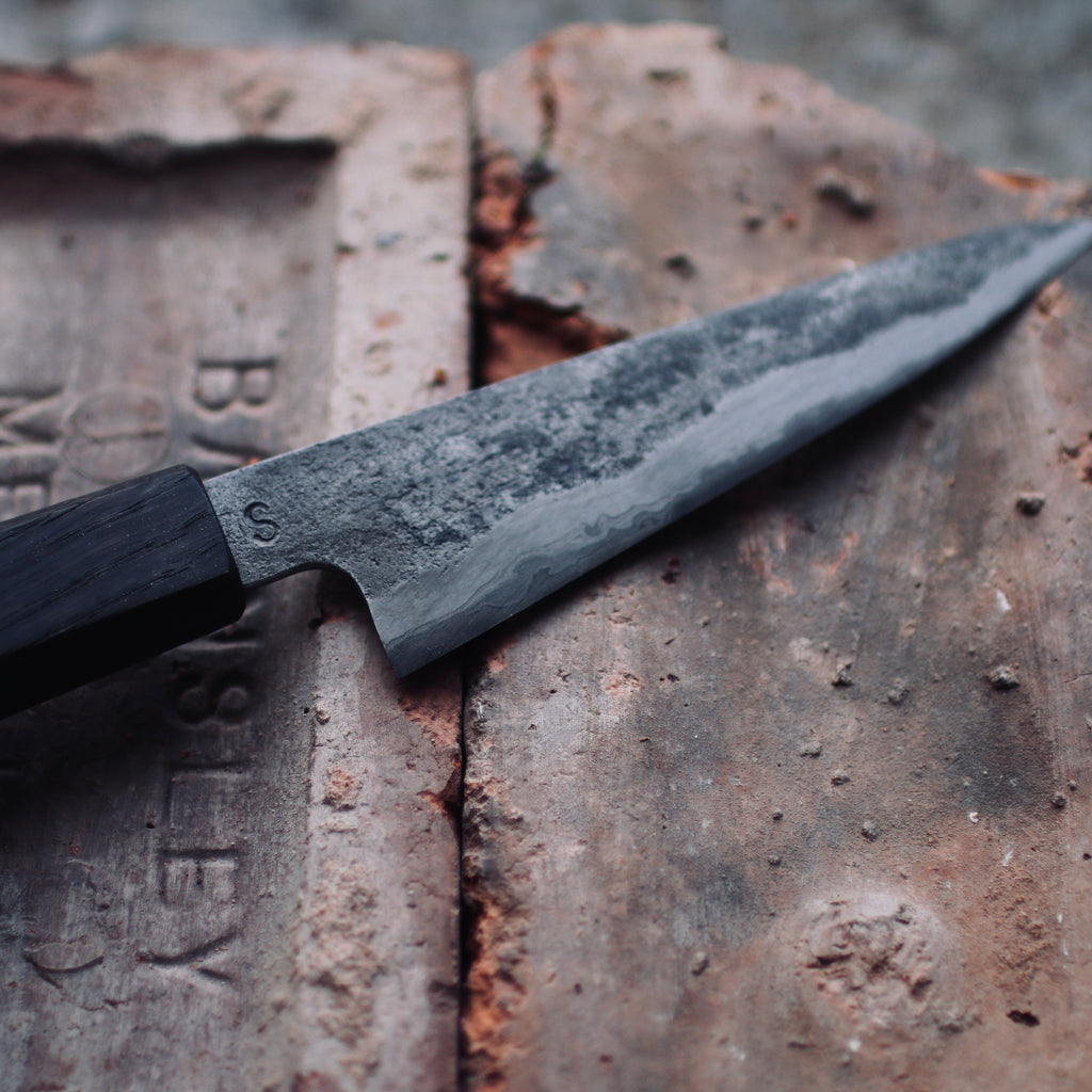 Petty 140x40mm, San-maï hand forged from 26C3 high carbon steel core and wrought iron cladding in Sheffield.