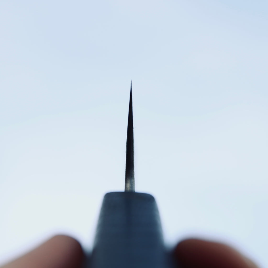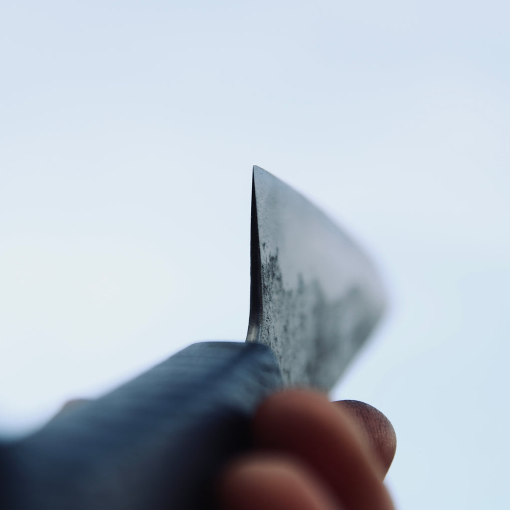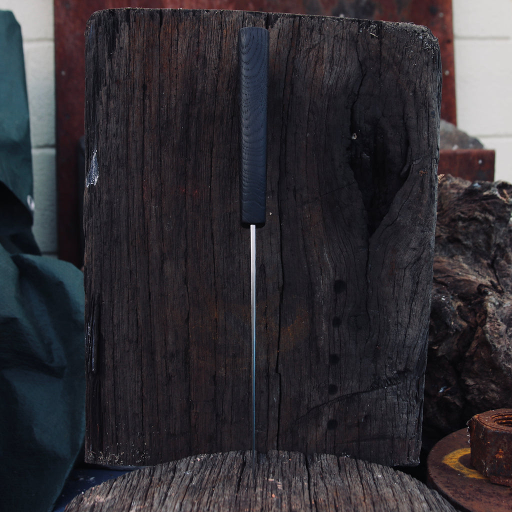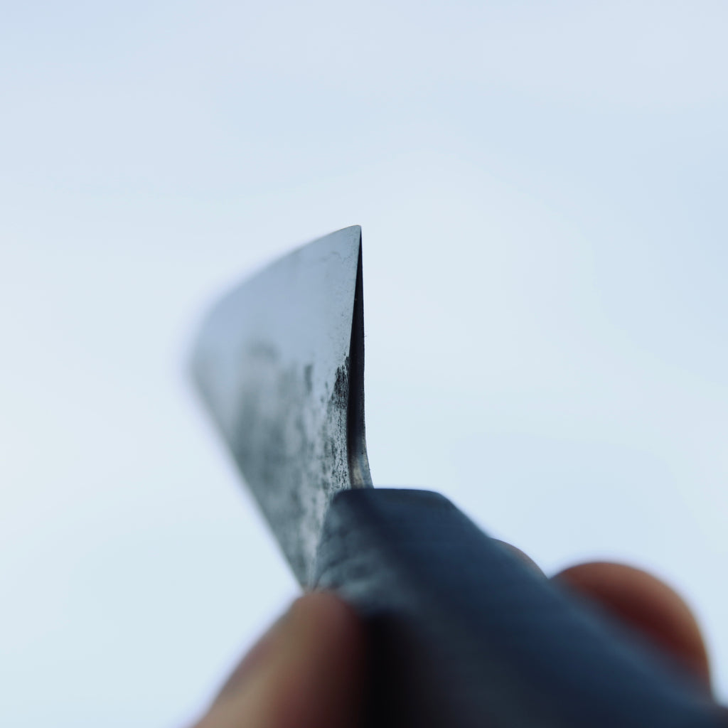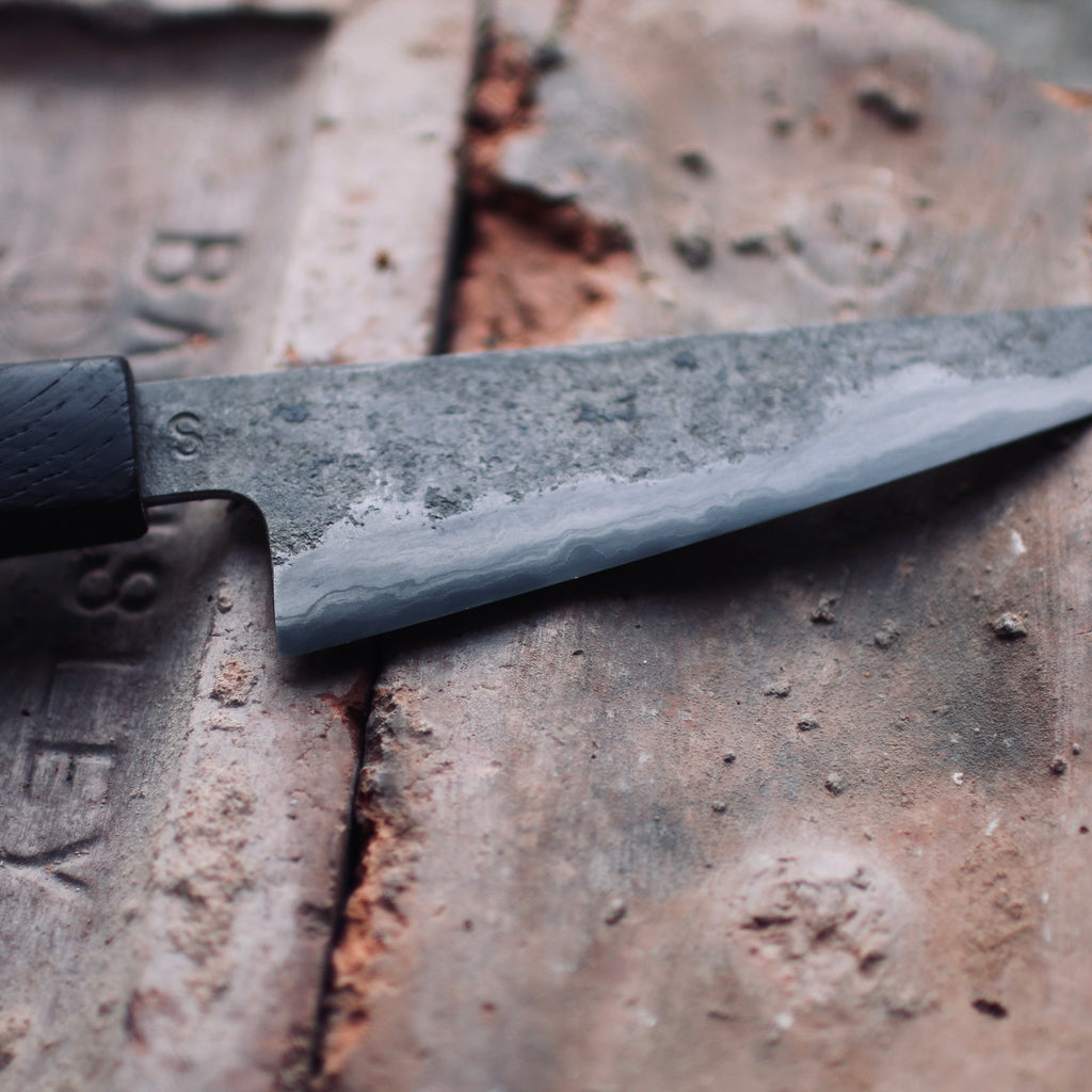 Kurouchi blade, flat double bevel, Etched.