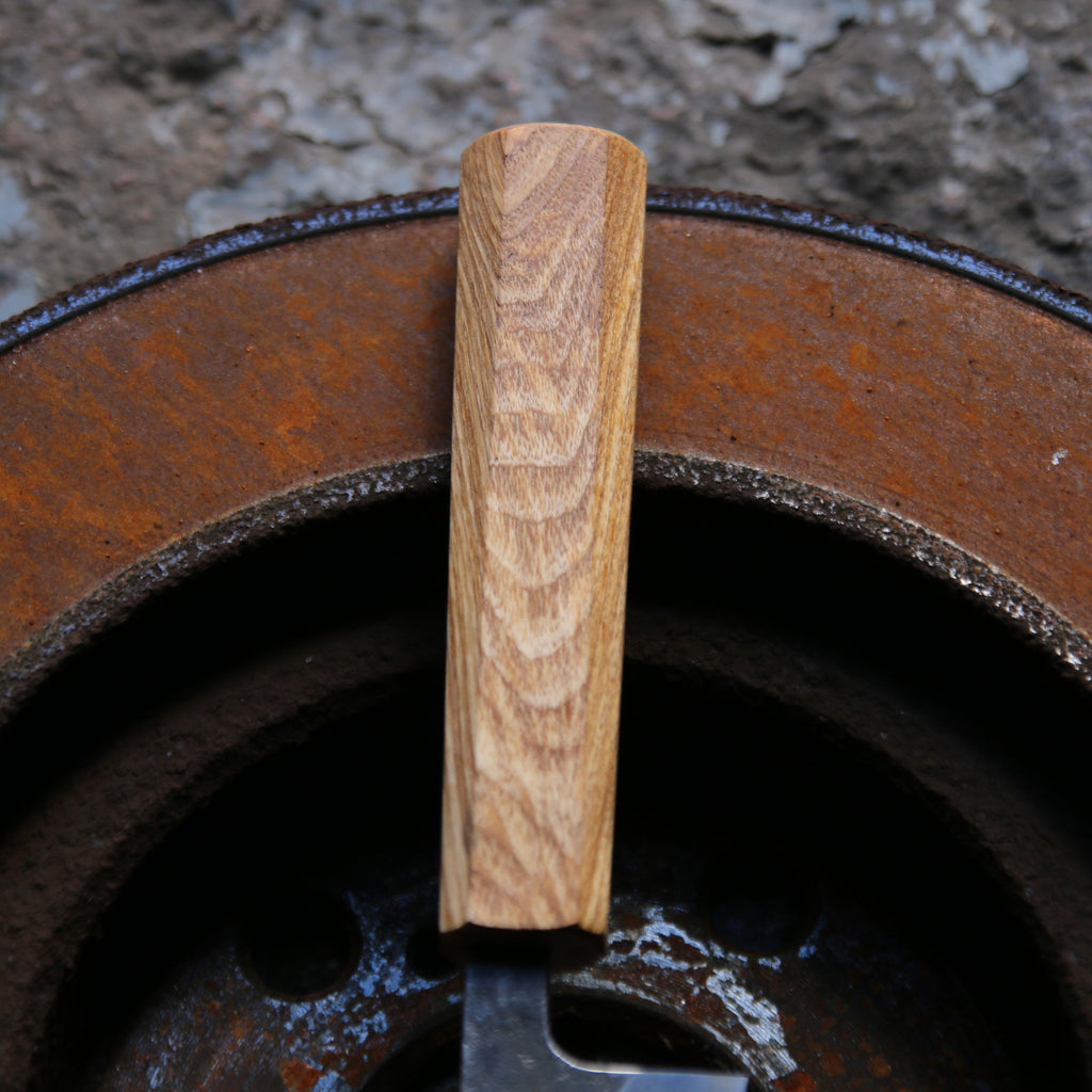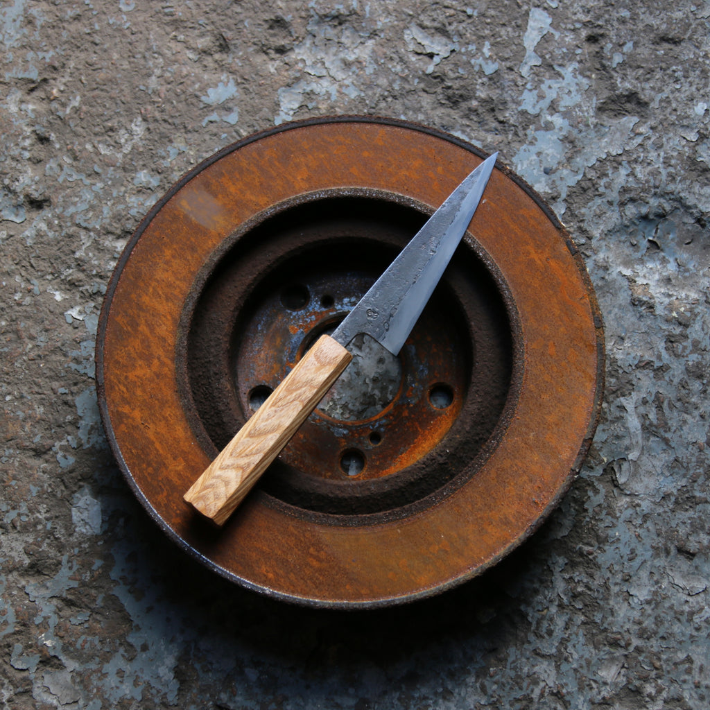 This Petty (Japanese paring knife) feature a short blade and very nimble tip. Shop made san-maï with 115CrV3 core and historic wrought iron cladding. Forged to shape and to geometry the bevels are free of low spot with a Kasumi, finish on Iromono. The handle is made with Olive Ash.