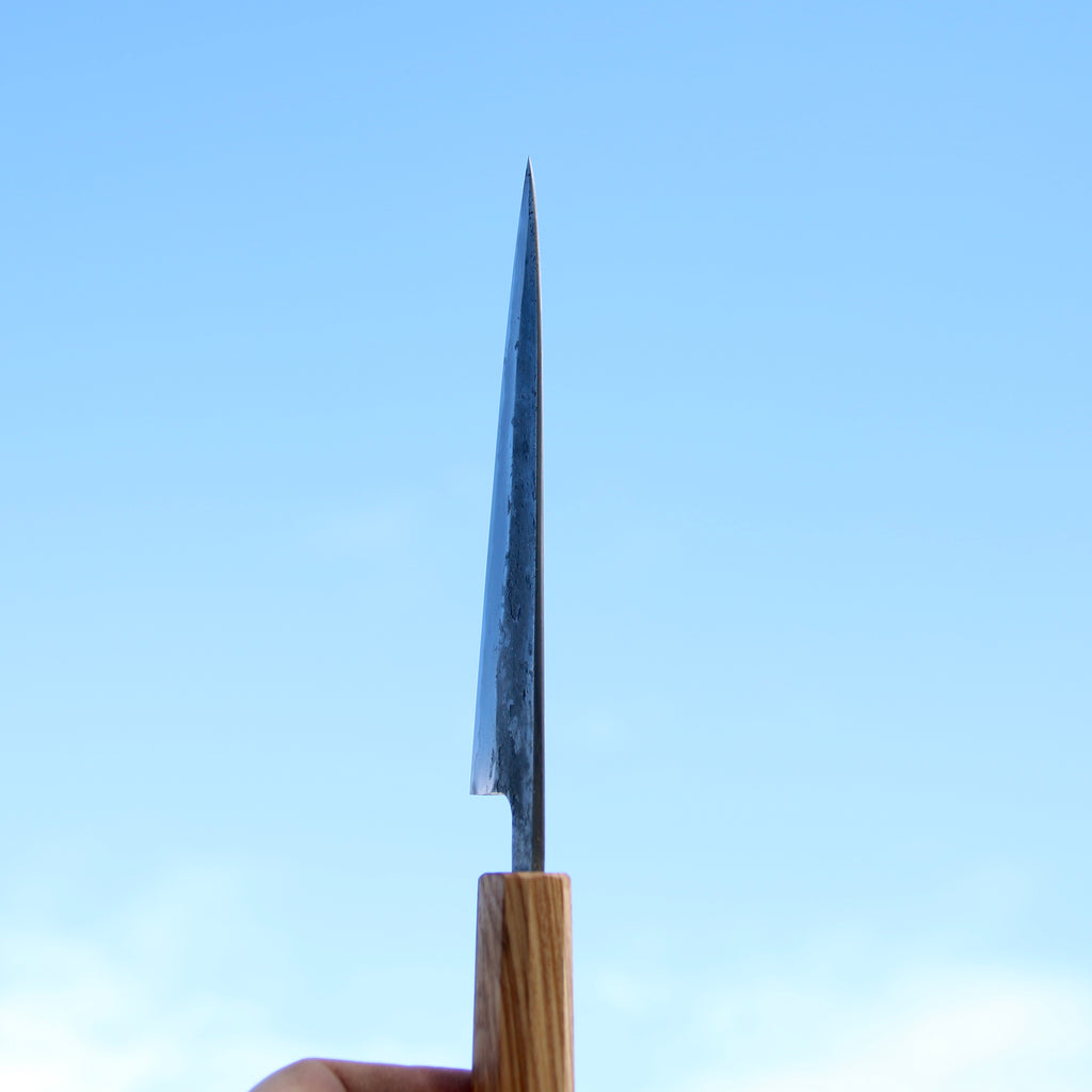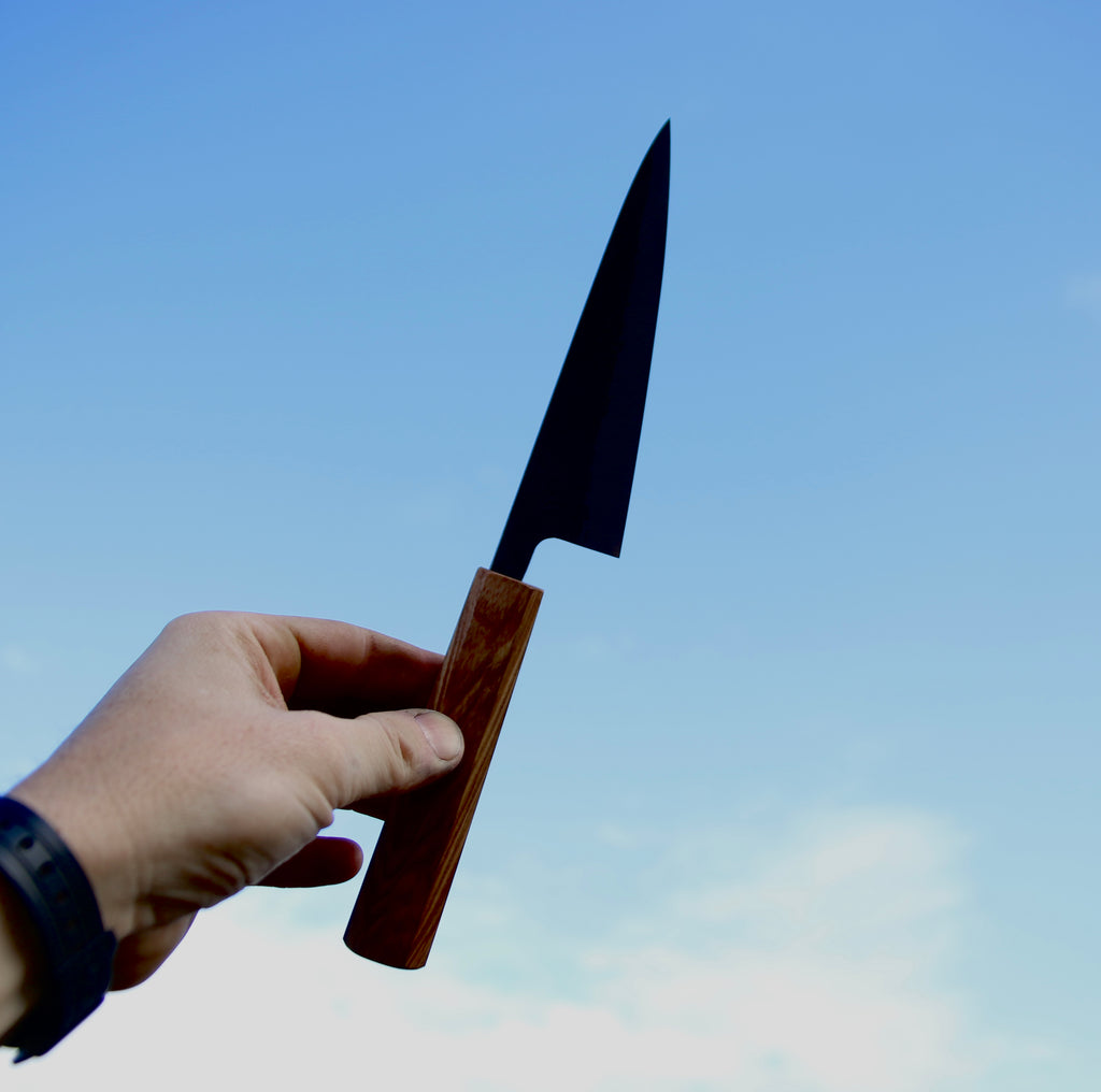 My blades are made from carbon steel not stainless steel, it gives my knives an unbeatable sharpness. I prefer carbon steel for it ease to sharpen, the fine edge it takes and the beautiful patina that will develop. You do, however, need to give carbon steel knives just a little extra care to keep them in top shape. There are trade-offs in everything.