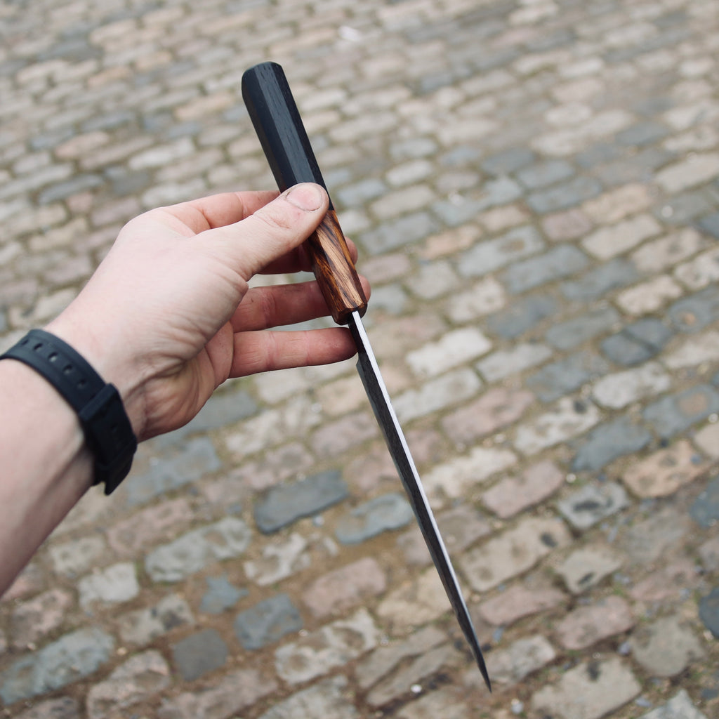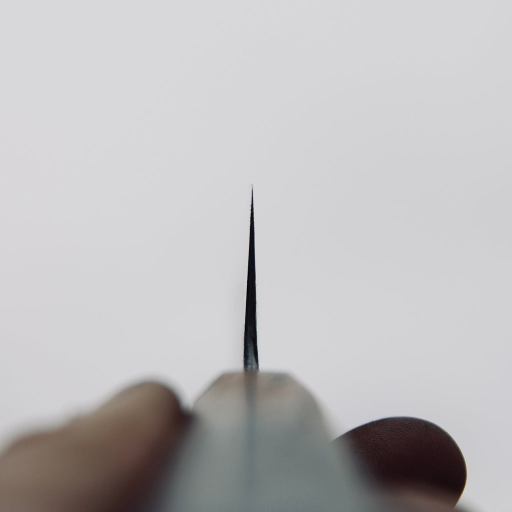 Kurouchi blade, flat double bevel with Kasumi polish.