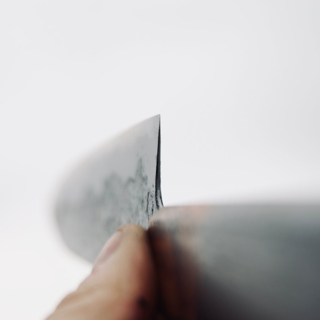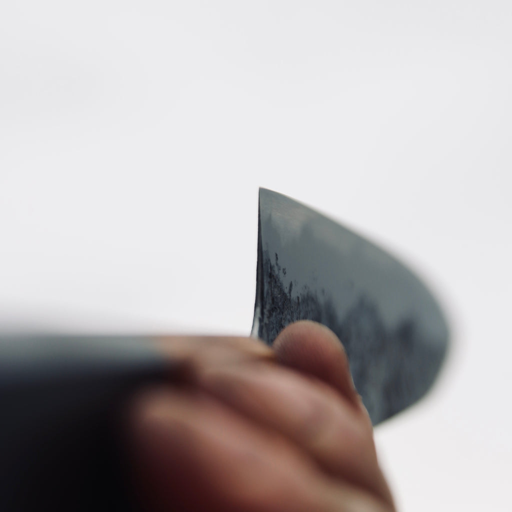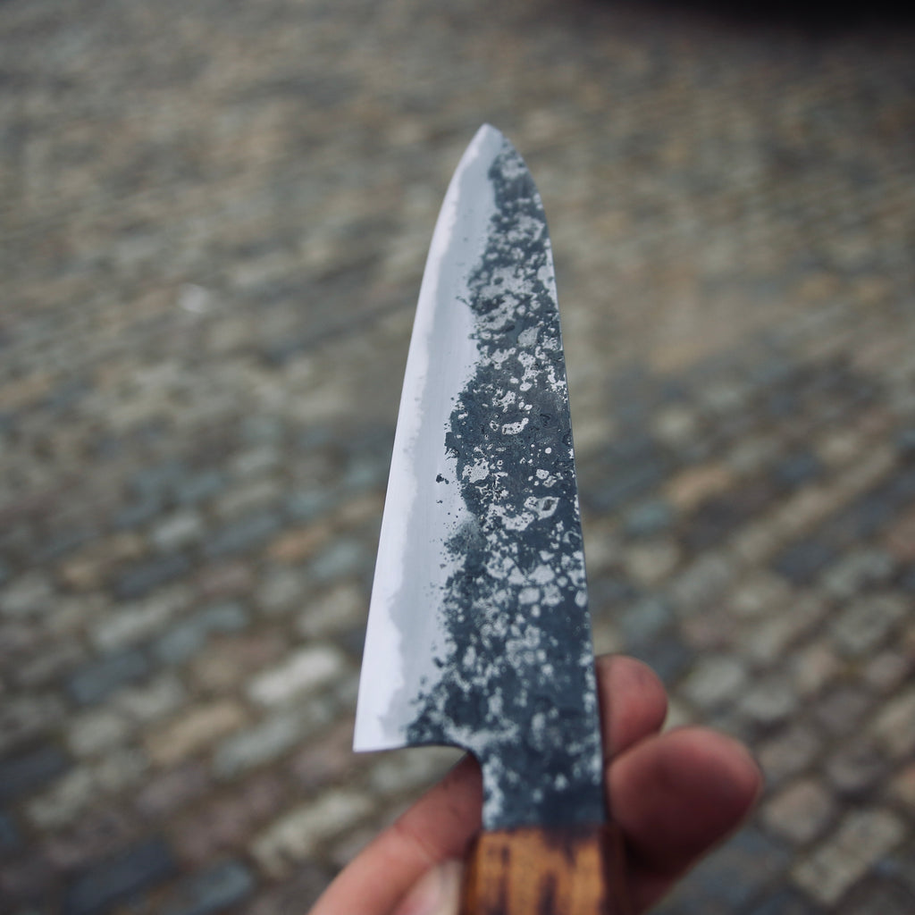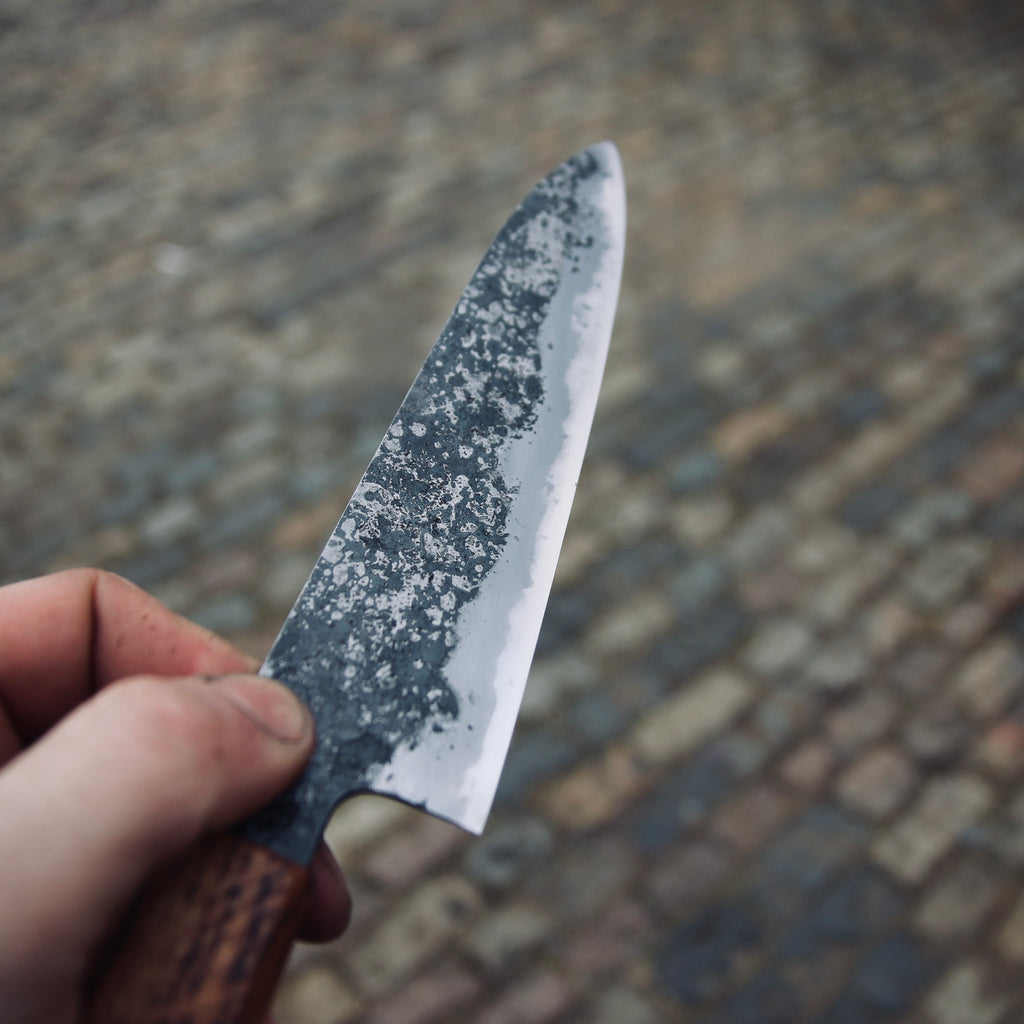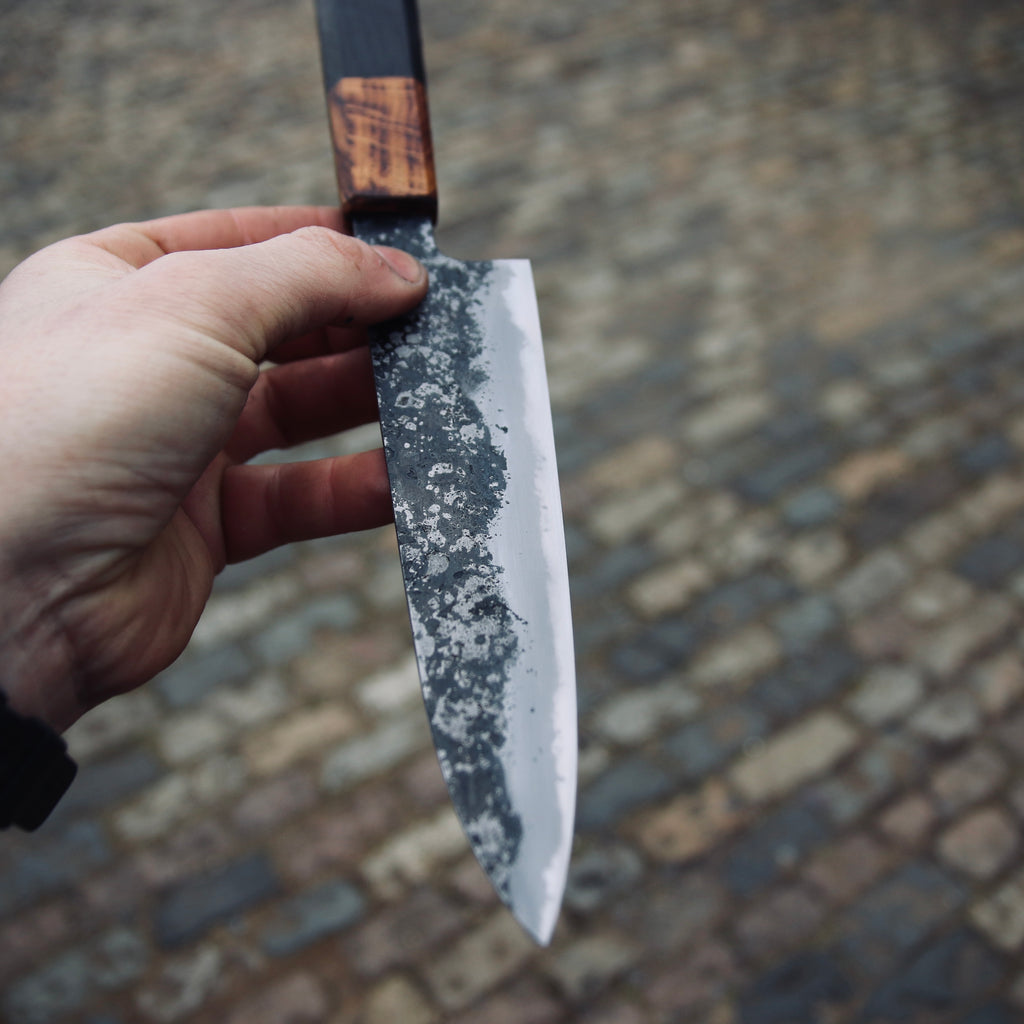 My blades are made from carbon steel not stainless steel, it gives my knives an unbeatable sharpness. I prefer carbon steel for it ease to sharpen, the fine edge it takes and the beautiful patina that will develop. You do, however, need to give carbon steel knives just a little extra care to keep them in top shape. There are trade-offs in everything.