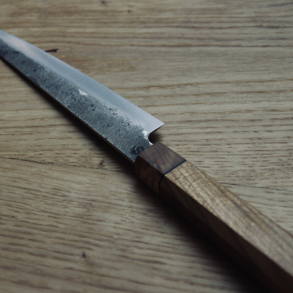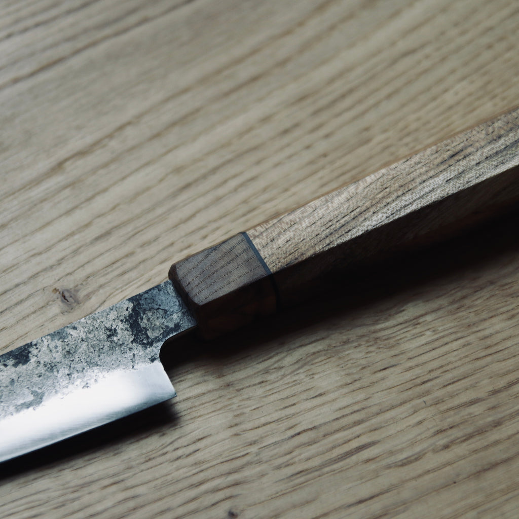 Kurouchi finish with flat grind. Double bevel