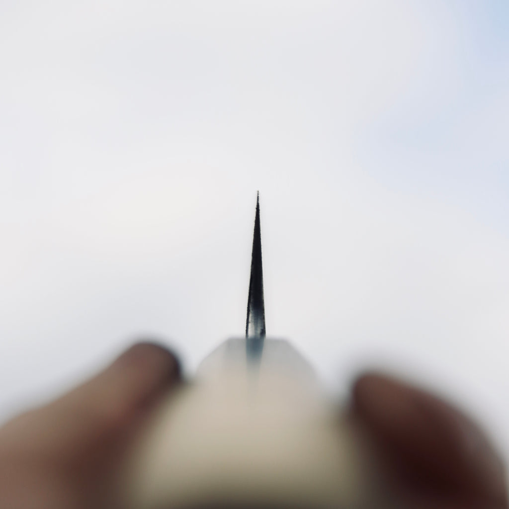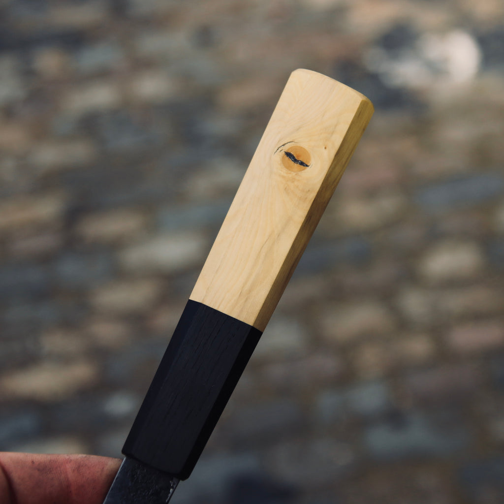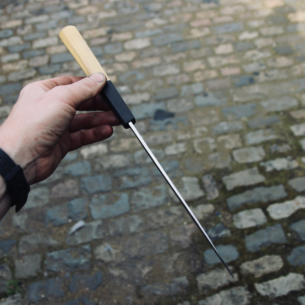 Thin Petty with nimble tip. Distal taper from 3.8mm at the handle to 2.4 mm mid blade to 0.8mm at the tip. Core harden at 63-64HRC.