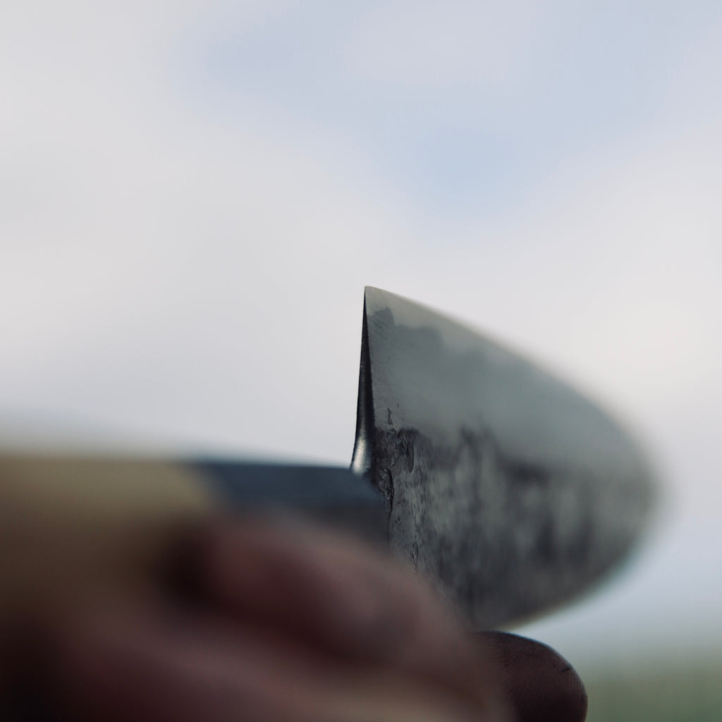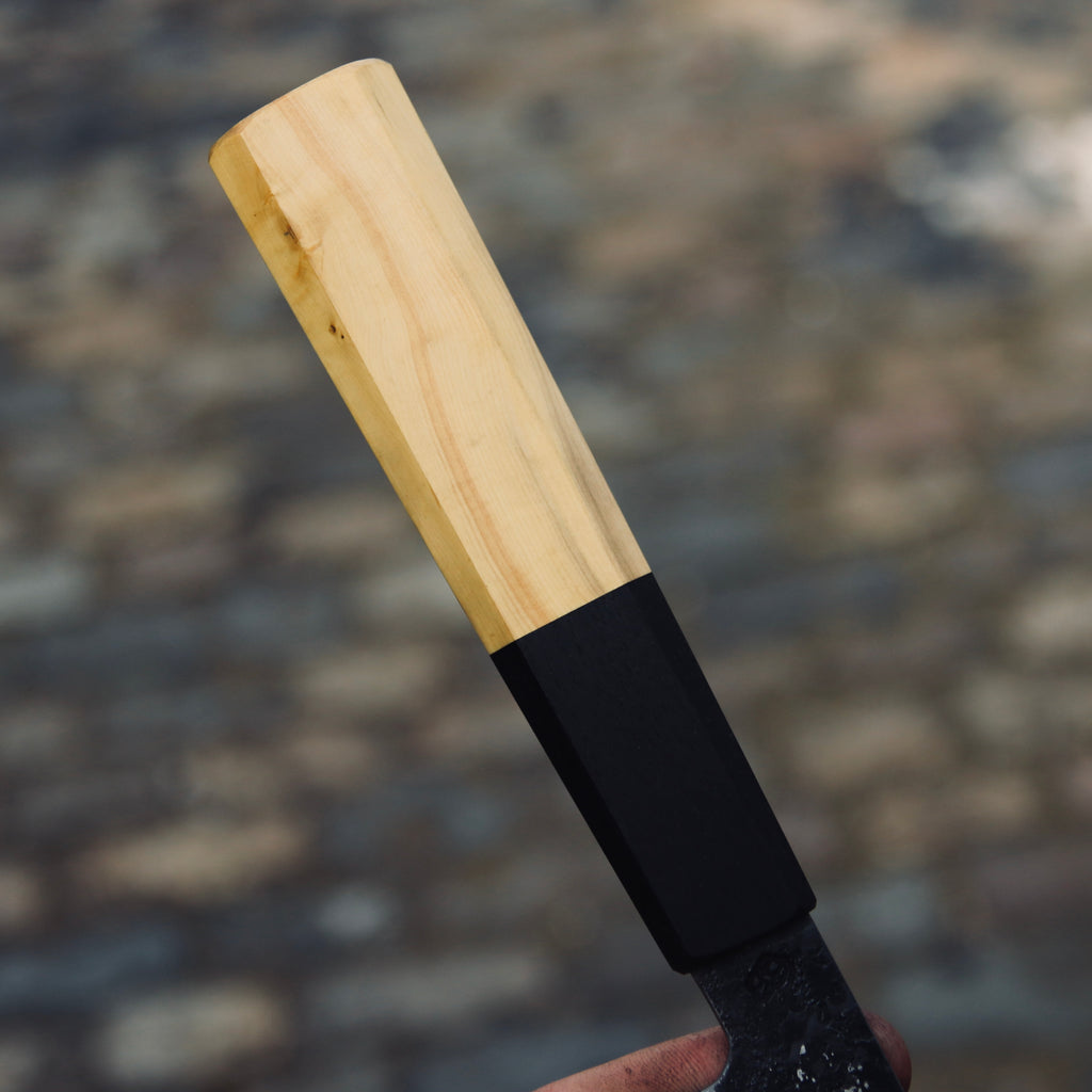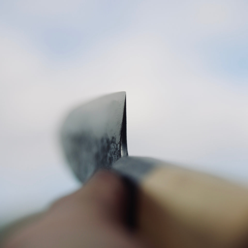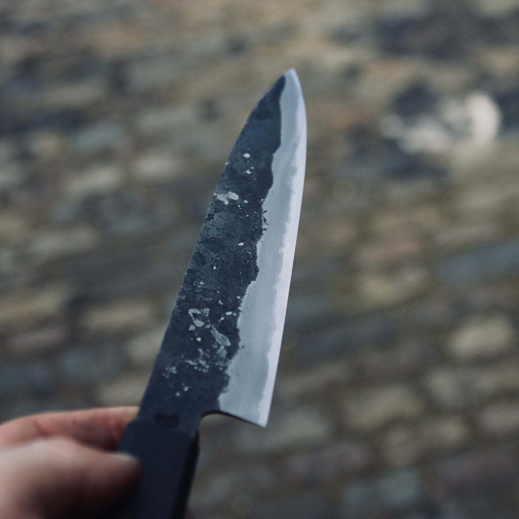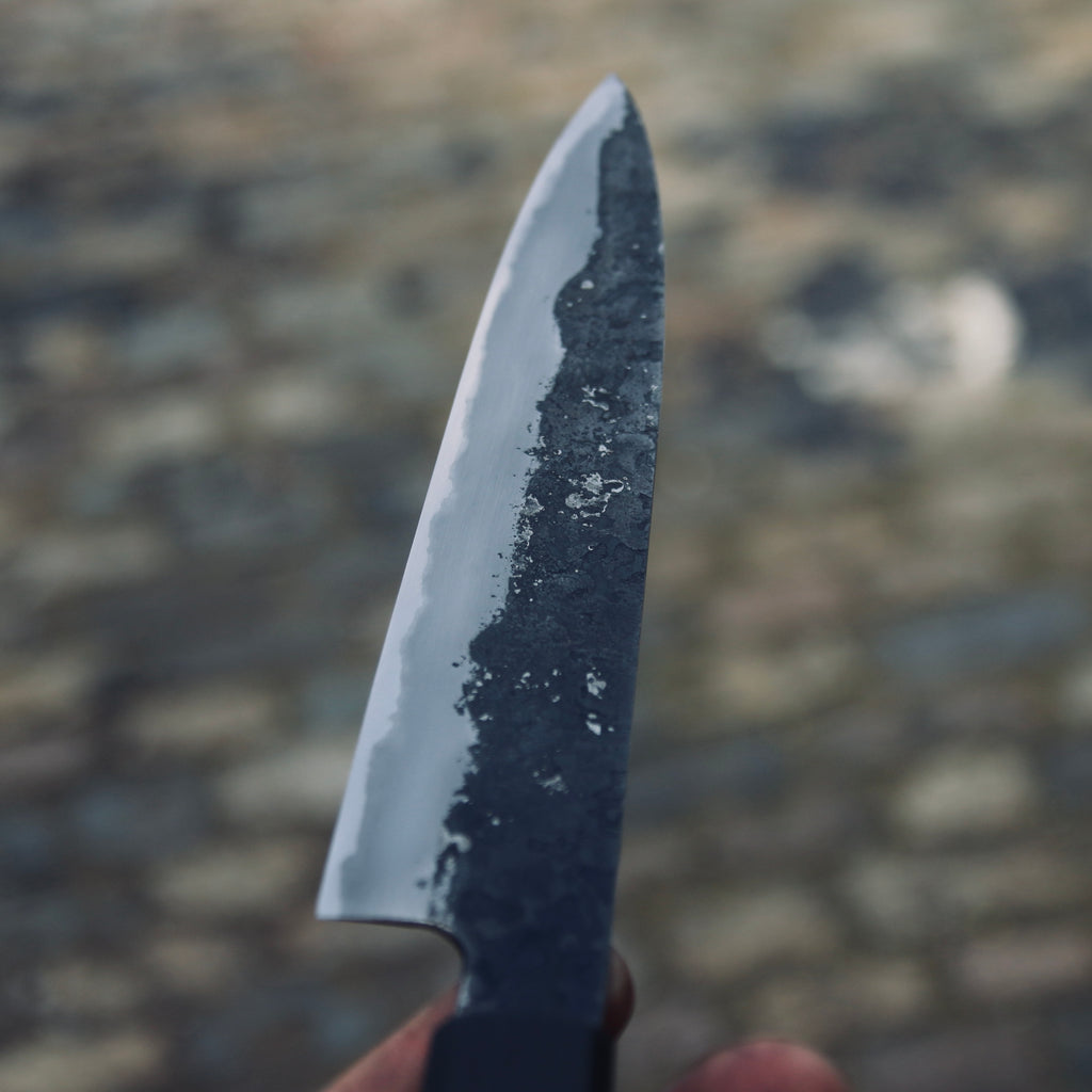 My blades are made from carbon steel not stainless steel, it gives my knives an unbeatable sharpness. I prefer carbon steel for it ease to sharpen, the fine edge it takes and the beautiful patina that will develop. You do, however, need to give carbon steel knives just a little extra care to keep them in top shape. There are trade-offs in everything.