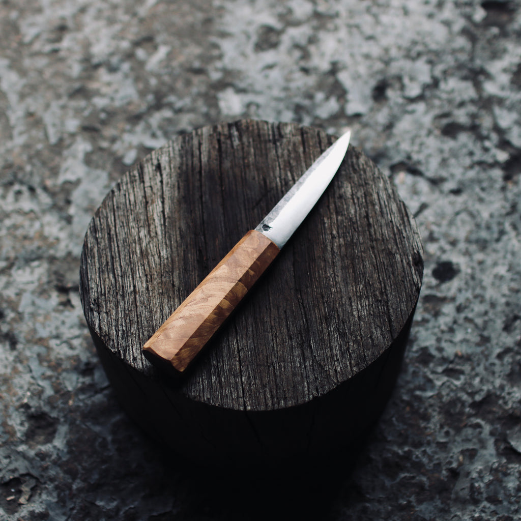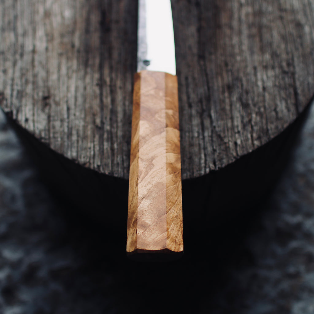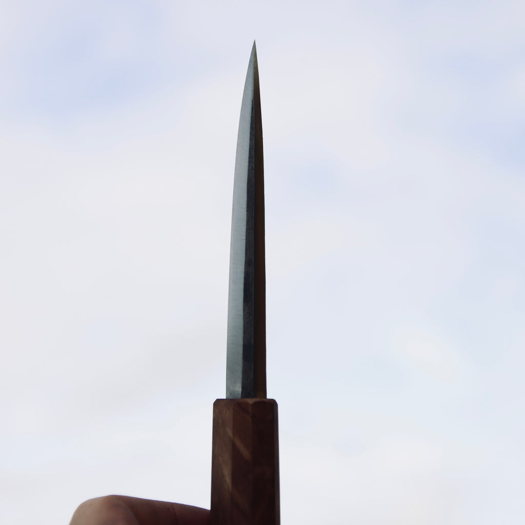 My blades are made from carbon steel not stainless steel, it gives my knives an unbeatable sharpness. I prefer carbon steel for it ease to sharpen, the fine edge it takes and the beautiful patina that will develop. You do, however, need to give carbon steel knives just a little extra care to keep them in top shape. There are trade-offs in everything.