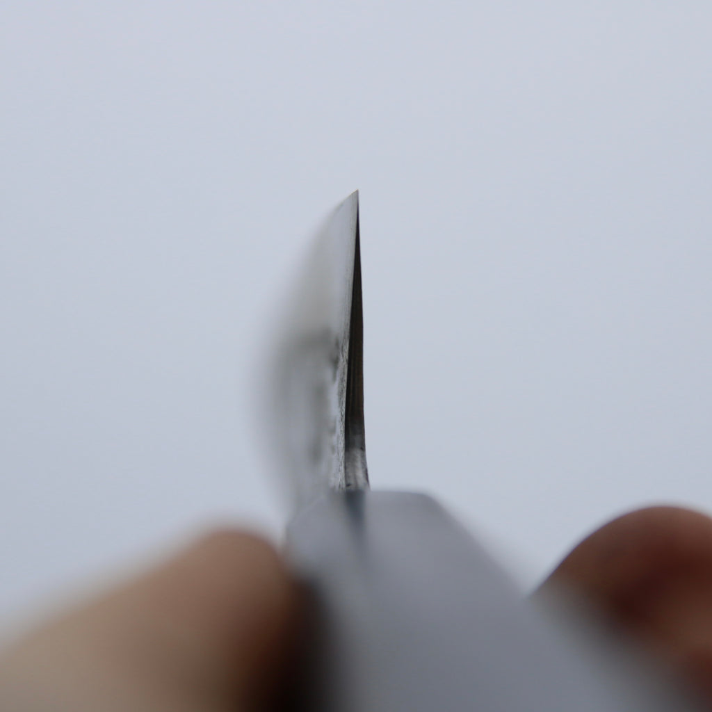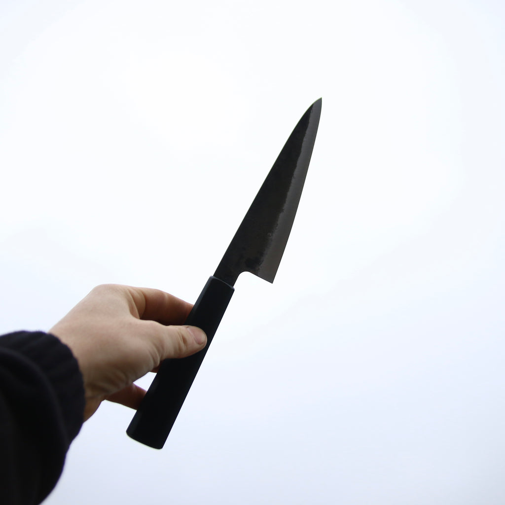 My blades are made from carbon steel not stainless steel, it gives my knives an unbeatable sharpness. I prefer carbon steel for it ease to sharpen, the fine edge it takes and the beautiful patina that will develop. You do, however, need to give carbon steel knives just a little extra care to keep them in top shape. There are trade-offs in everything.