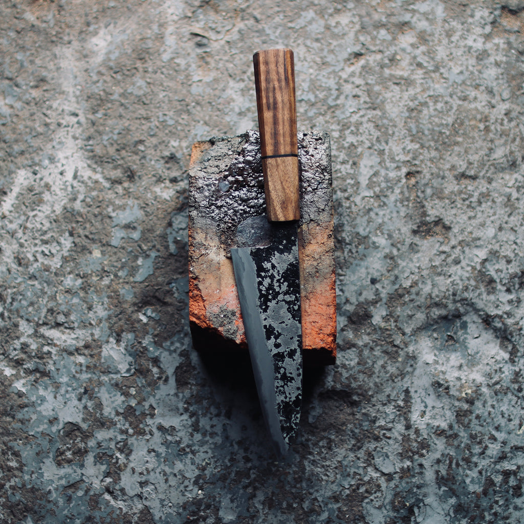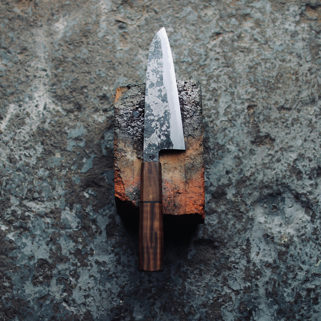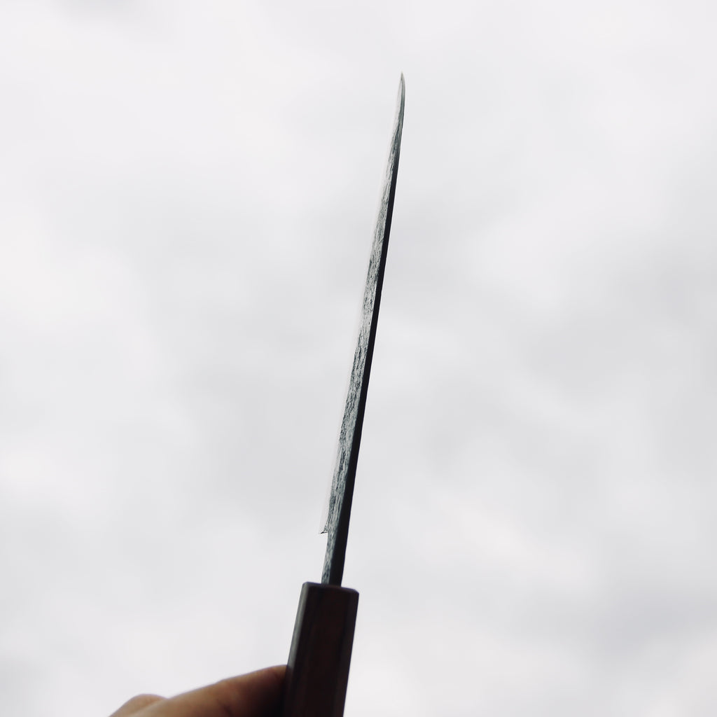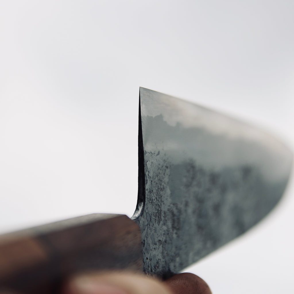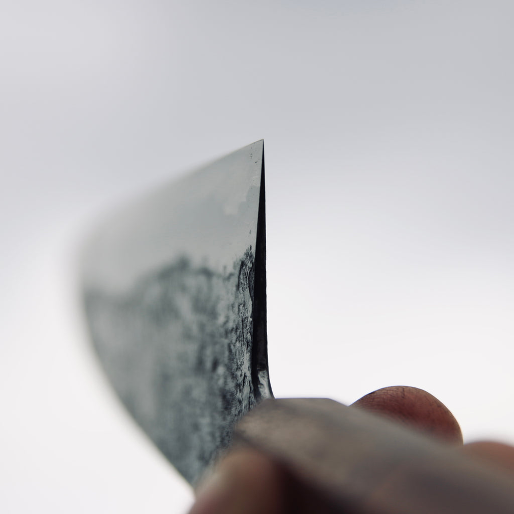My blades are made from carbon steel not stainless steel, it gives my knives an unbeatable sharpness. I prefer carbon steel for it ease to sharpen, the fine edge it takes and the beautiful patina that will develop. You do, however, need to give carbon steel knives just a little extra care to keep them in top shape. There are trade-offs in everything.