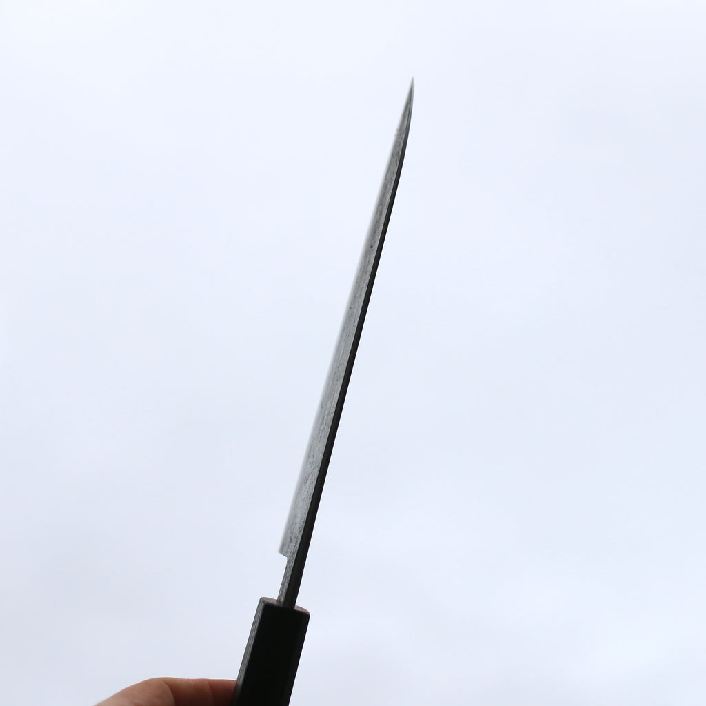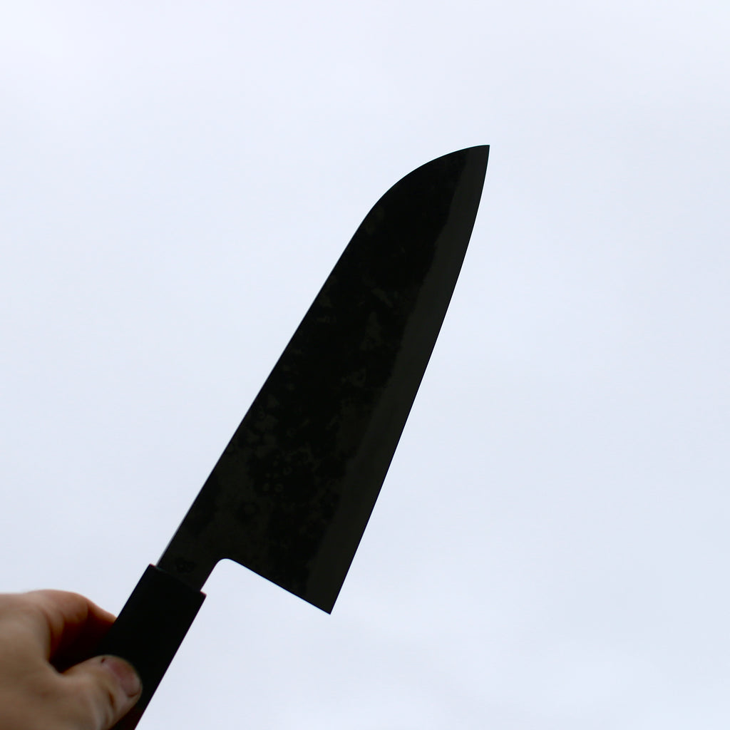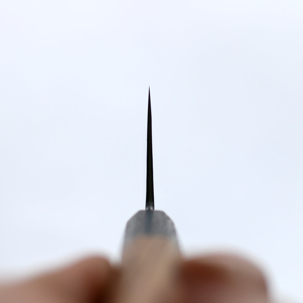 This Nashiji Santoku feature a short but tall blade, good distal taper, and thin tip. Flat profile with a slight curve toward the tip. The san-maï is made from 135Cr3 core steel with soft steel cladding. Forged to shape and to geometry the bevels are ground on water cooled grinding stone with a satin finish.