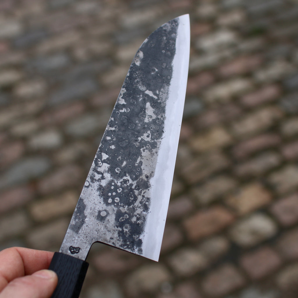 My blades are made from carbon steel not stainless steel, it gives my knives an unbeatable sharpness. I prefer carbon steel for it ease to sharpen, the fine edge it takes and the beautiful patina that will develop. You do, however, need to give carbon steel knives just a little extra care to keep them in top shape. There are trade-offs in everything. Claddings stated as "dirty wrought iron" will be very reactive.
