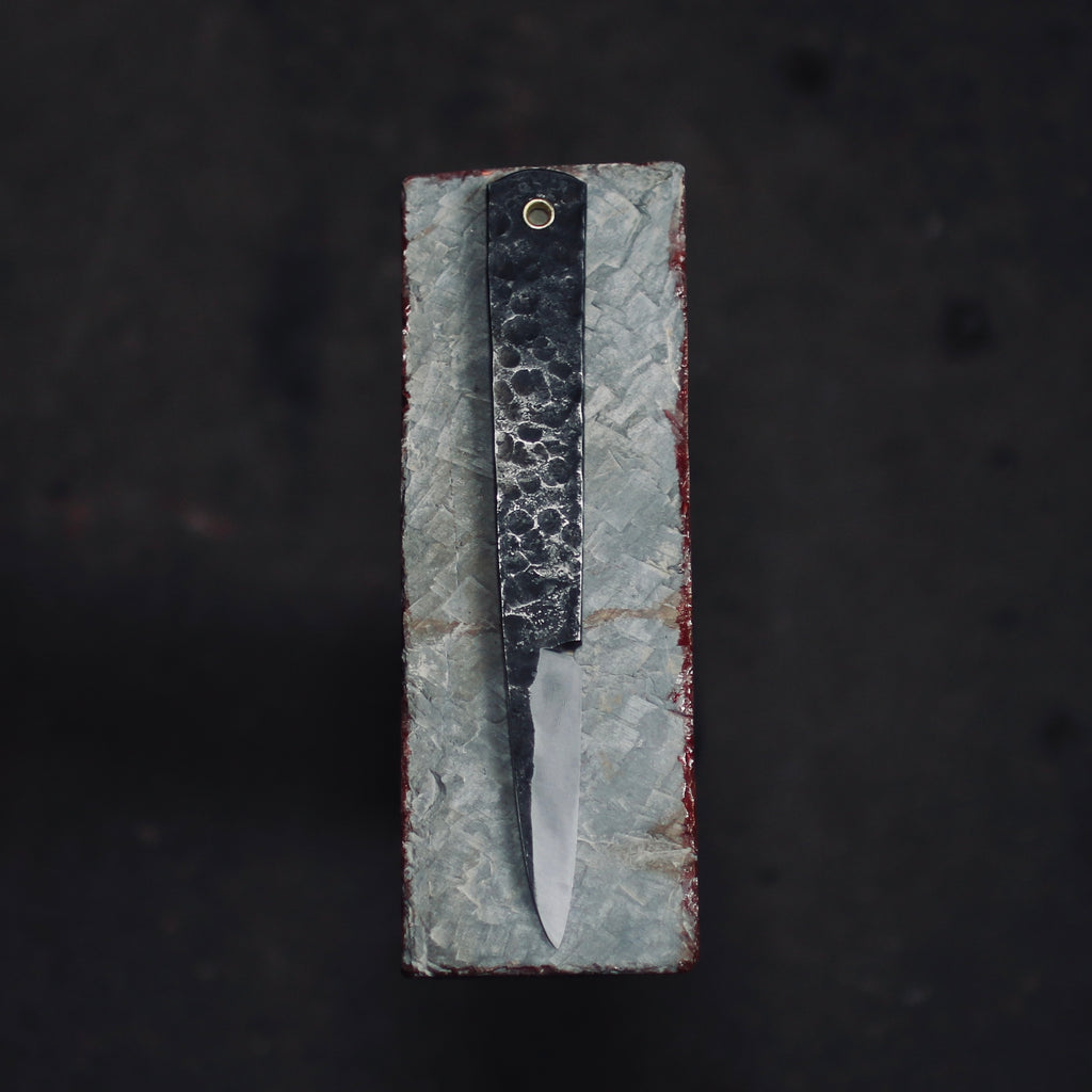 Textured handle with brass hollow rivet and black paracord, 115mm length.