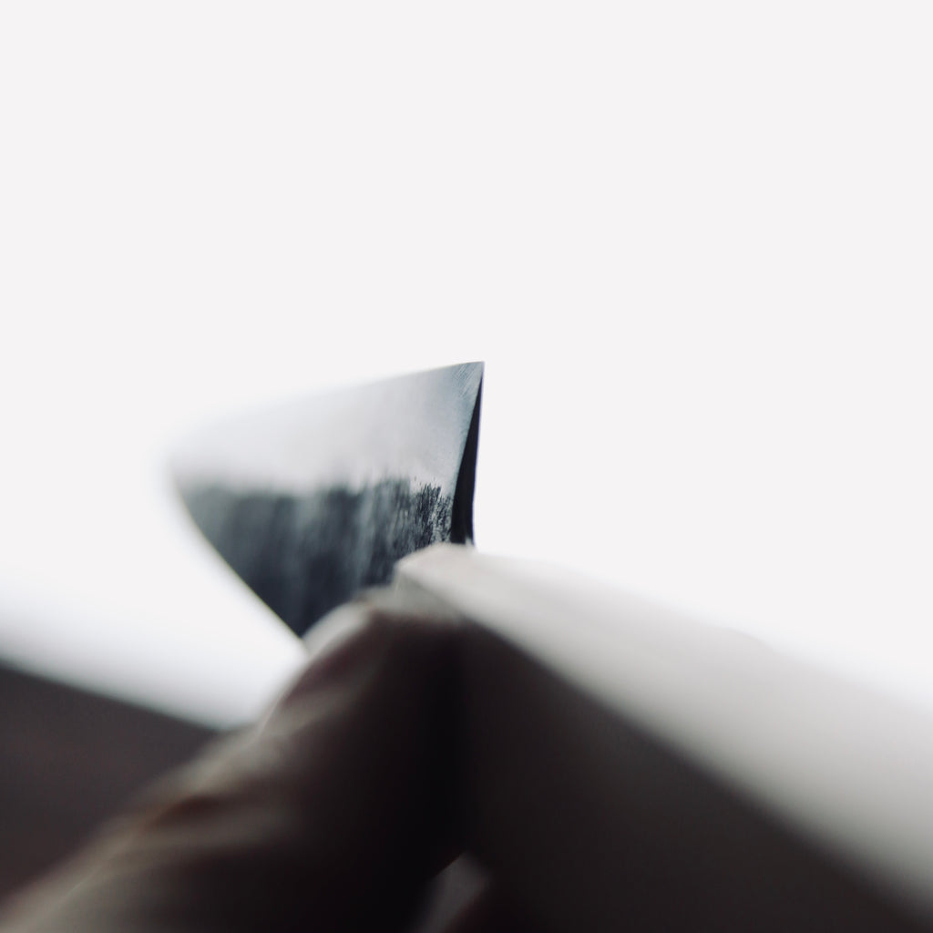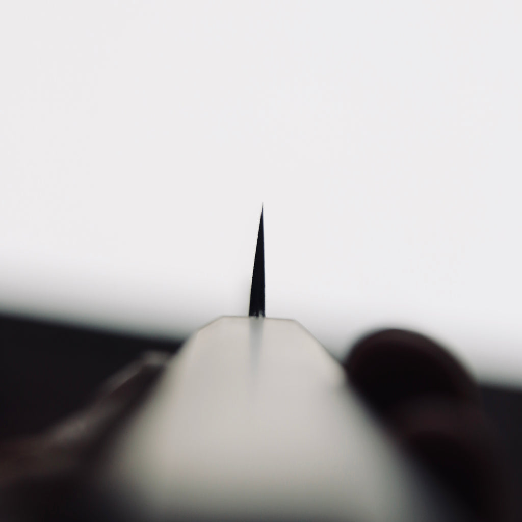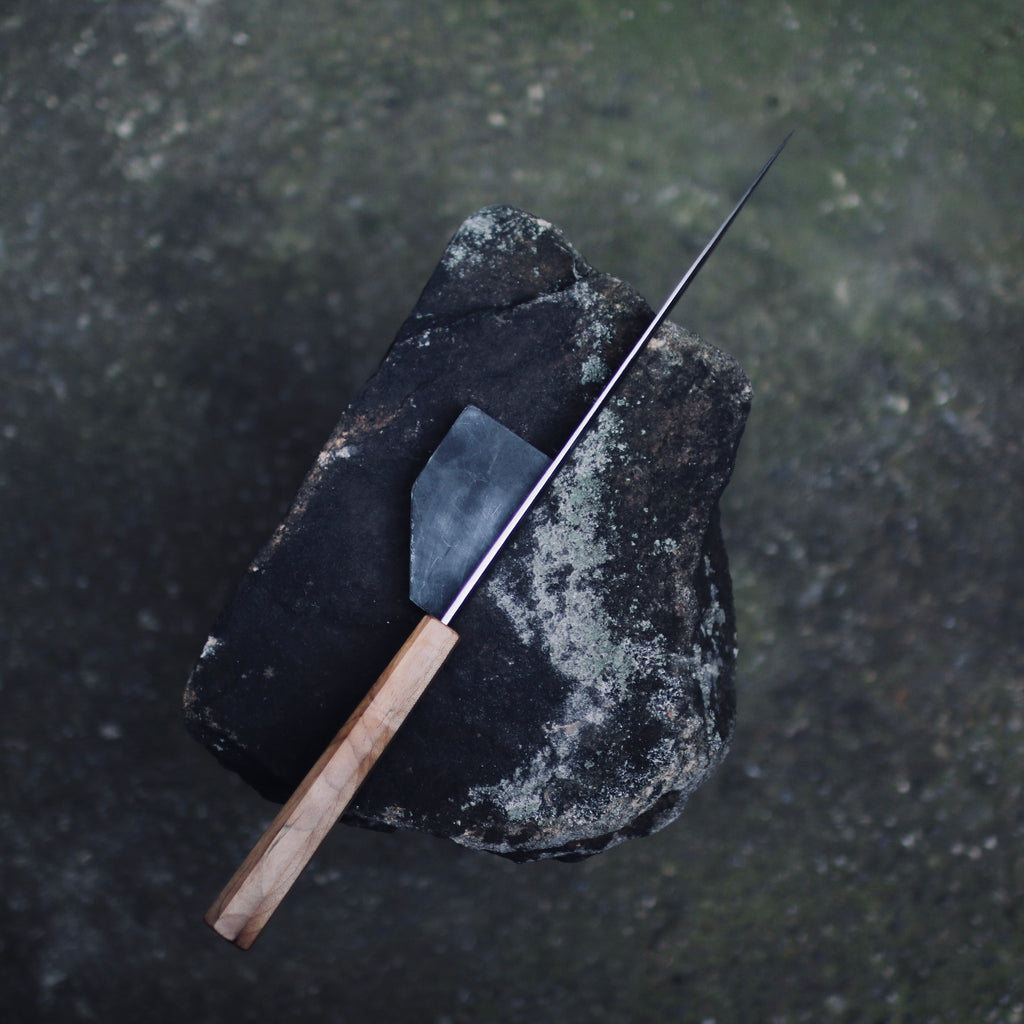 Kurouchi finish, flat grind (Kasumi ready). Double bevel