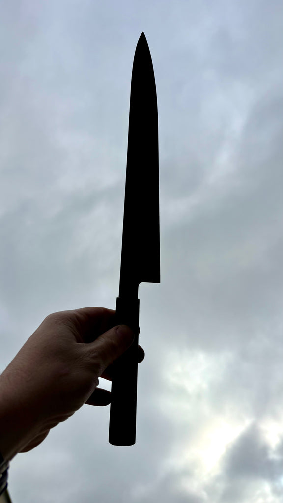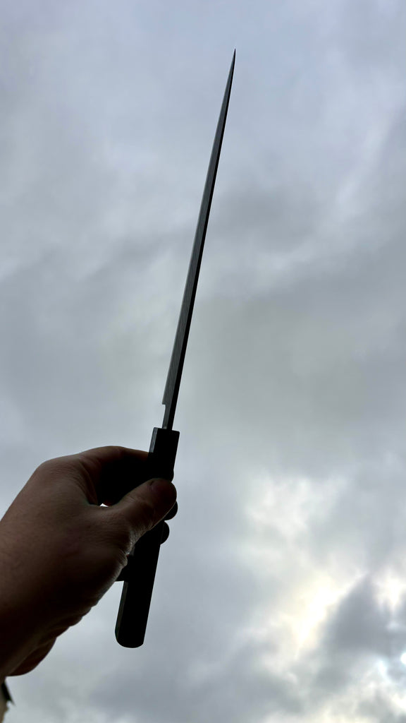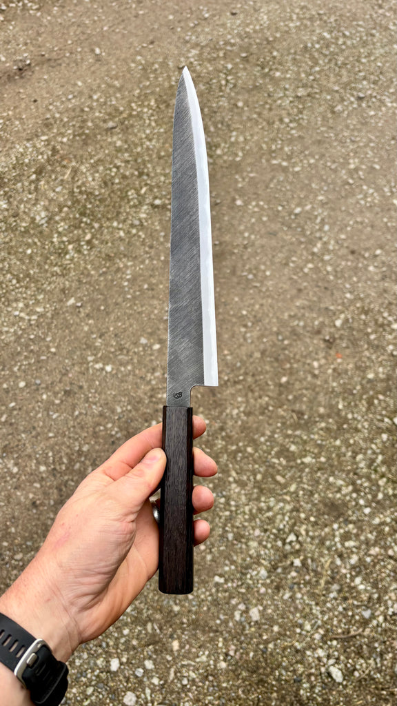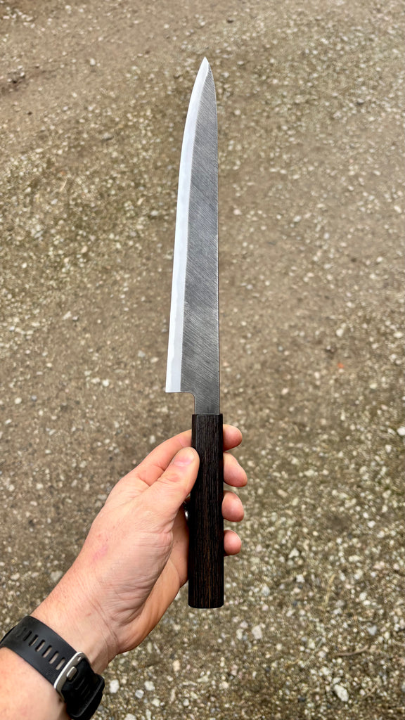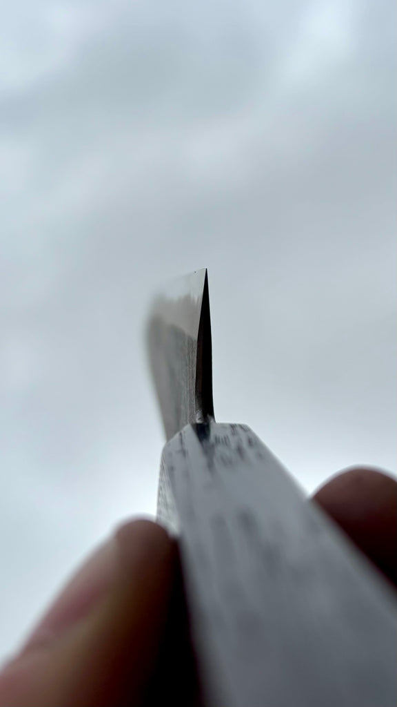 This Kira Sujihiki feature a long and shallow blade, good distal taper, and thin tip. Flat profile at the heel with a slight curve toward the tip. The San-mai is made from 135Cr3 steel core with soft steel cladding. Forged to shape and to geometry the blade is ground on water cooled grinding wheel.