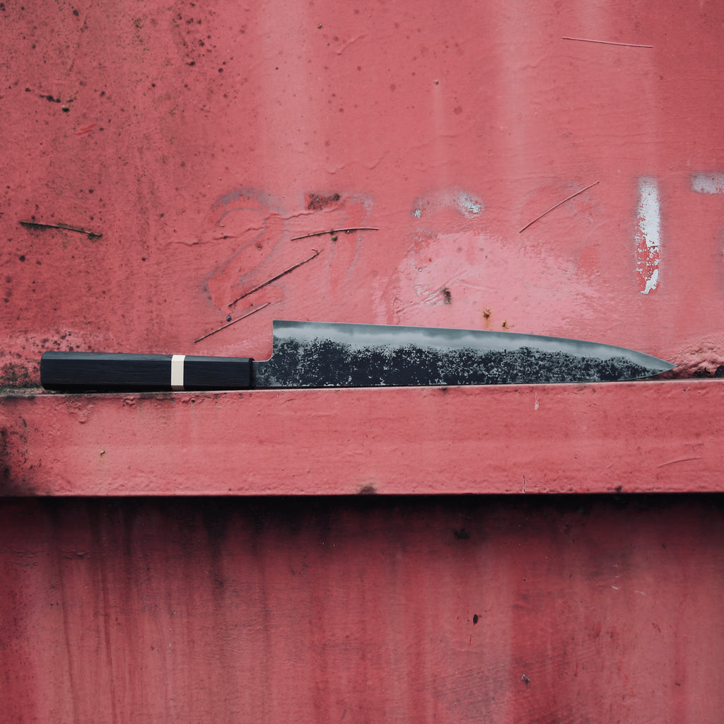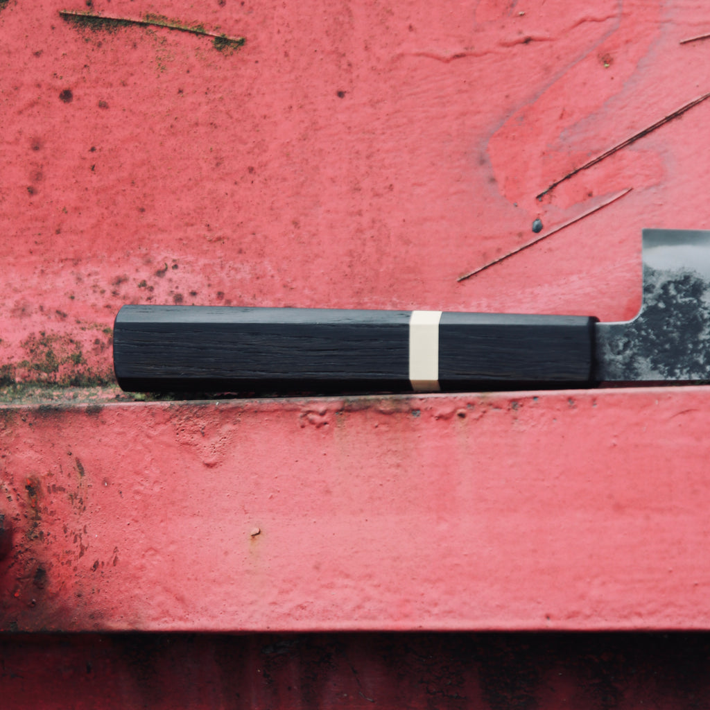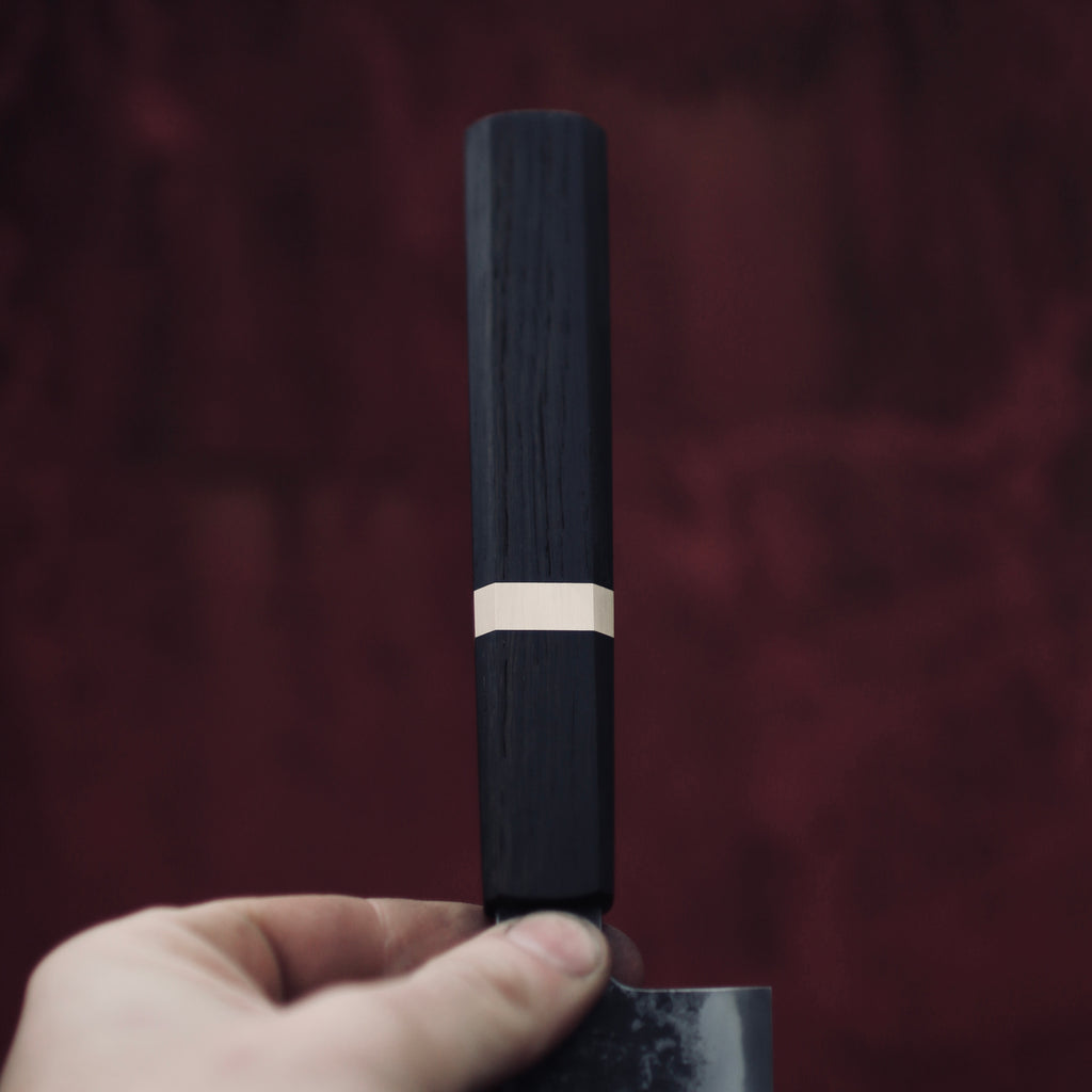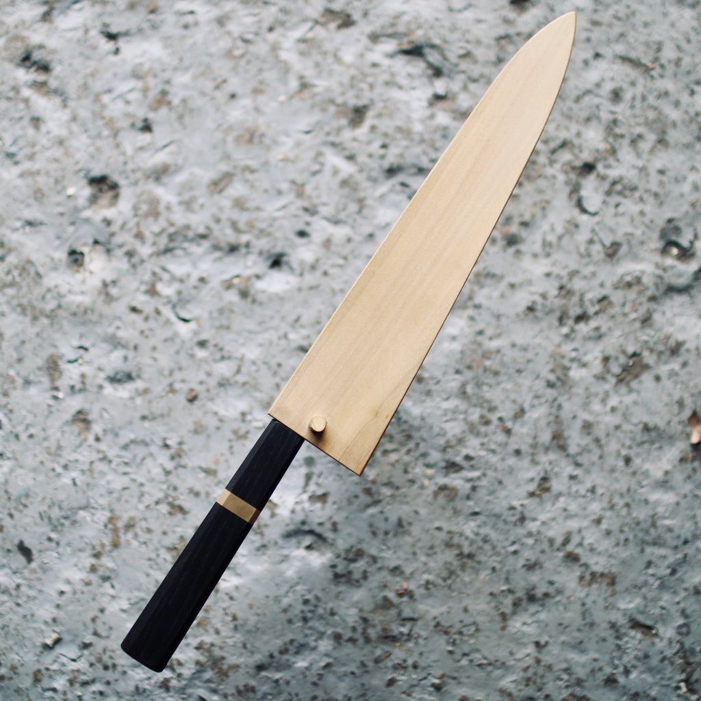 This knife is an hybrid between a Suji and a Gyuto. Being quite tall (50mm) it allow to be use on the chopping board as well as a slicer. The heavy bog oak and brass handle give a good balance to the knife. Distal Taper from 3.9mm to 2.2mm to 0.7mm