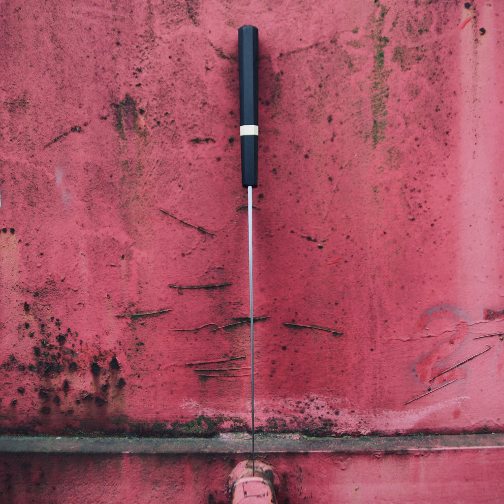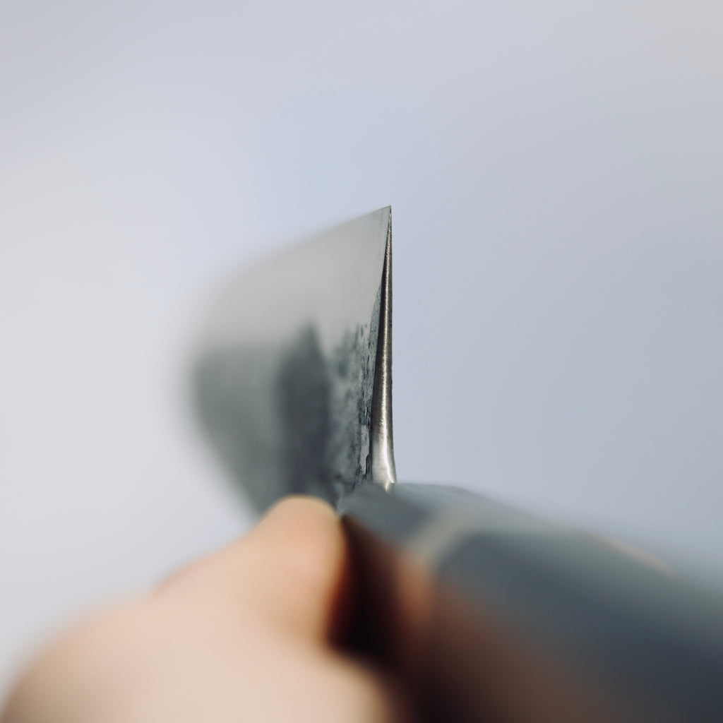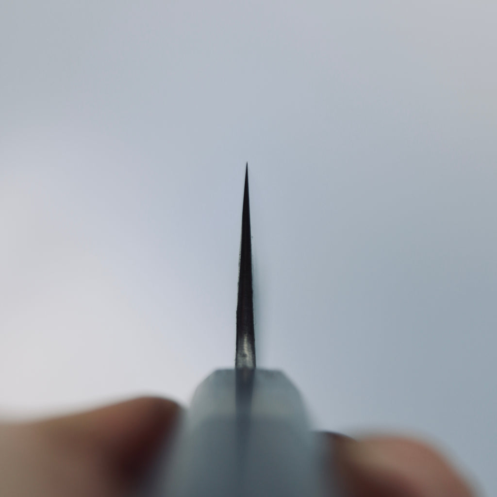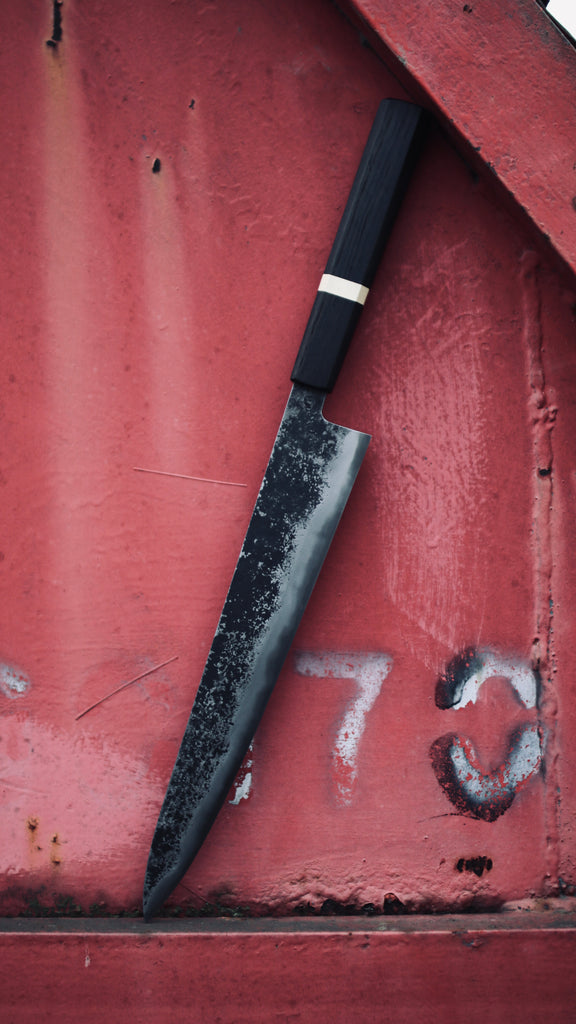 This knife is an hybrid between a Suji and a Gyuto. Being quite tall (50mm) it allow to be use on the chopping board as well as a slicer. The heavy bog oak and brass handle give a good balance to the knife. Distal Taper from 3.9mm to 2.2mm to 0.7mm