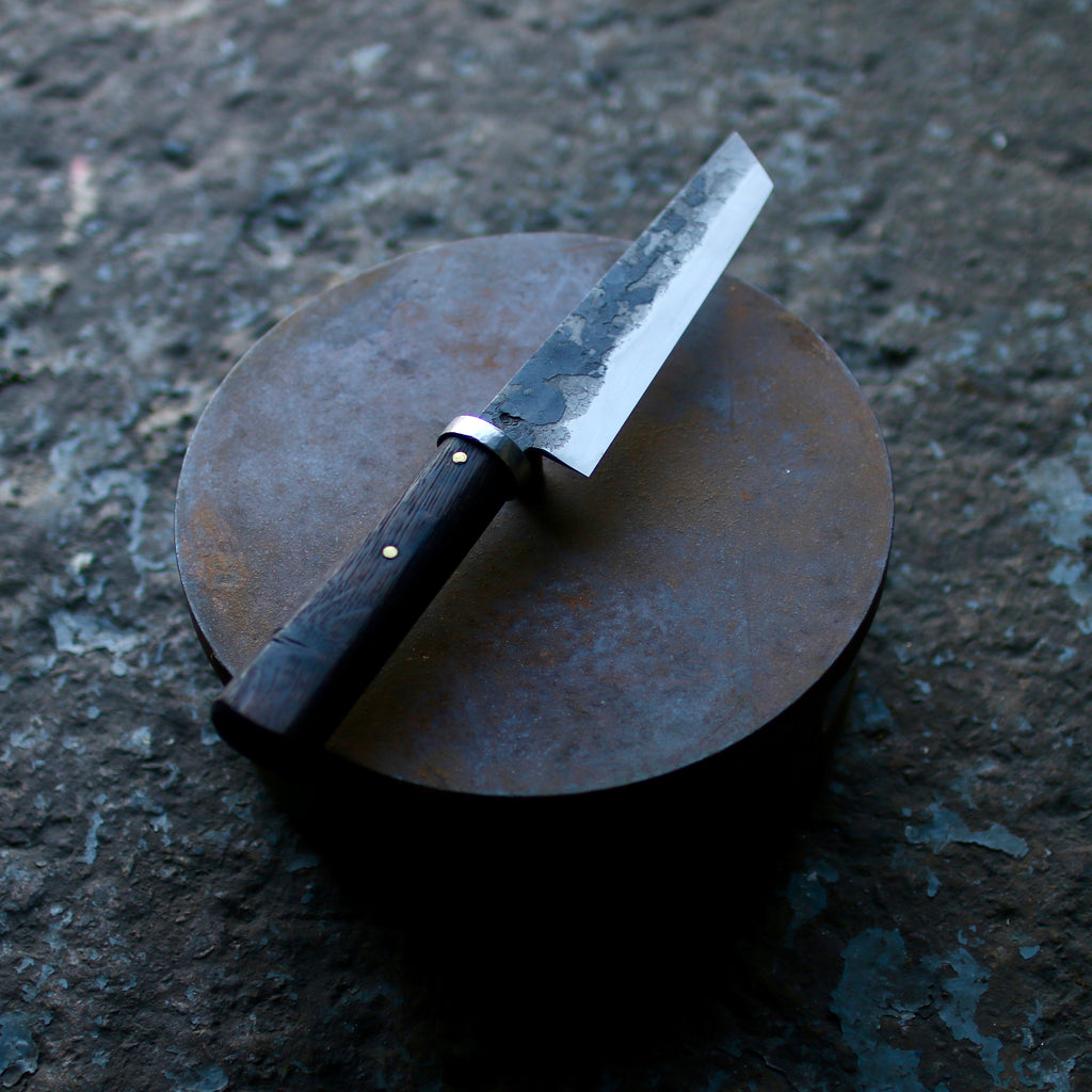 This Tanto cleaver feature a short and thick blade, good distal taper, and tanto tip. This is the knife you you will use in the kitchen and the garden. It can chop bones or hard roots and it's not a fragile blade. The weight and asymetric bevel give him very good cutting performance with a lot of resilience. The san-mai is made from XC70 core steel with soft steel cladding. Forged to shape and to geometry the bevels are ground on water cooled grinding stone with a satin finish. The core is fairly soft (55HRC)