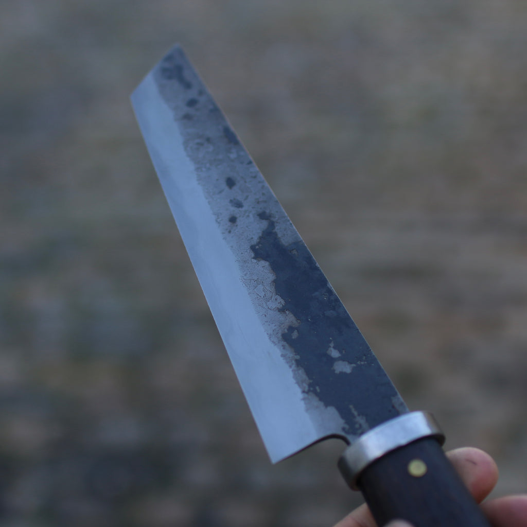 My blades are made from carbon steel not stainless steel, it gives my knives an unbeatable sharpness. I prefer carbon steel for it ease to sharpen, the fine edge it takes and the beautiful patina that will develop. You do, however, need to give carbon steel knives just a little extra care to keep them in top shape. There are trade-offs in everything. Claddings stated as "dirty wrought iron" will be very reactive.