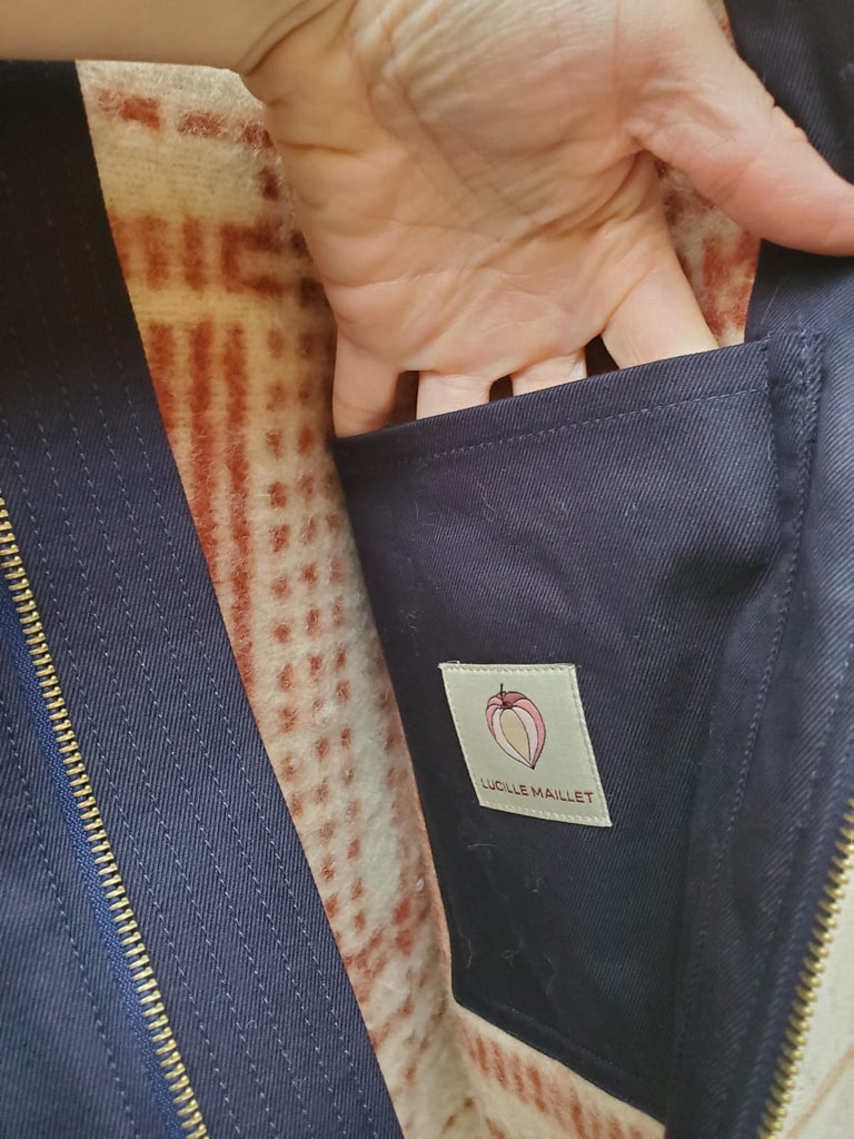 The out layer is made from a deadstock navy cotton twill. This is a fabric that will only get softer with wear and time. The inside is made from repurpose 100% wool blanket. To keep your jacket looking its best you can machine wash, then hang to dry.